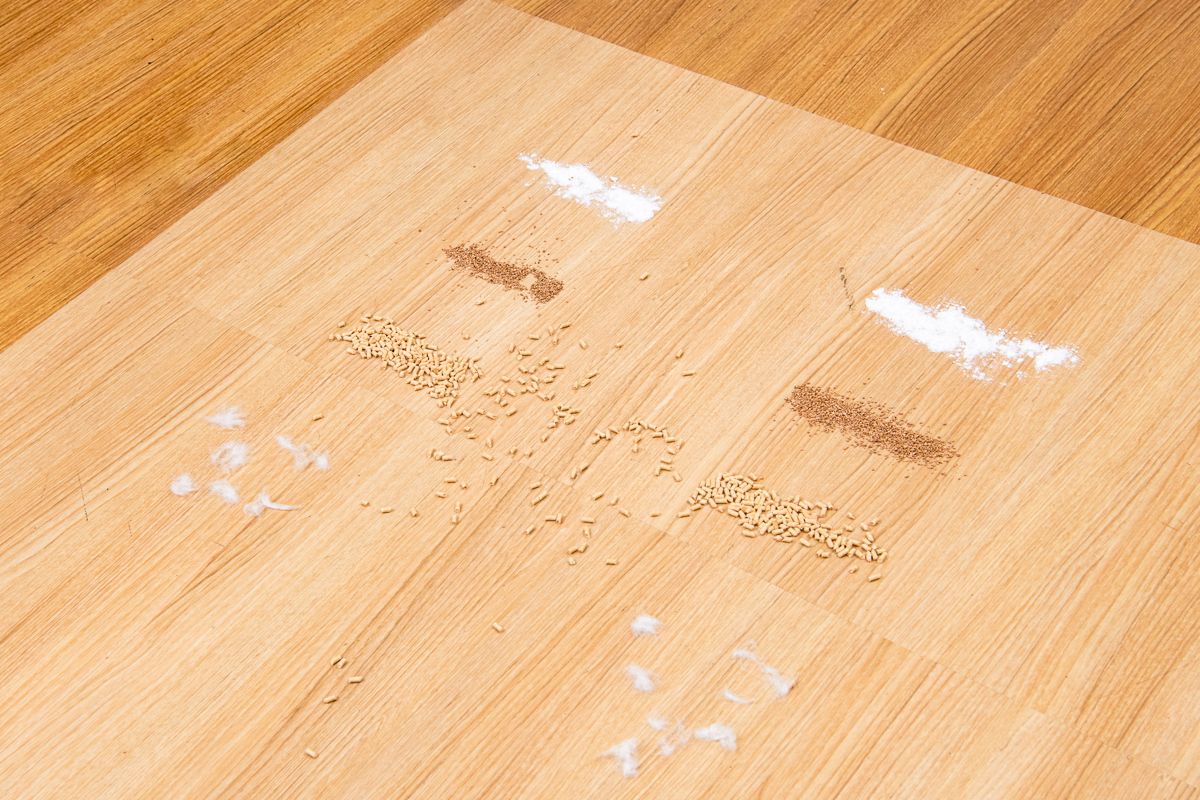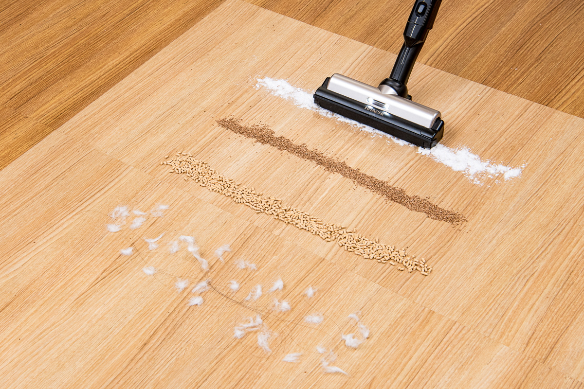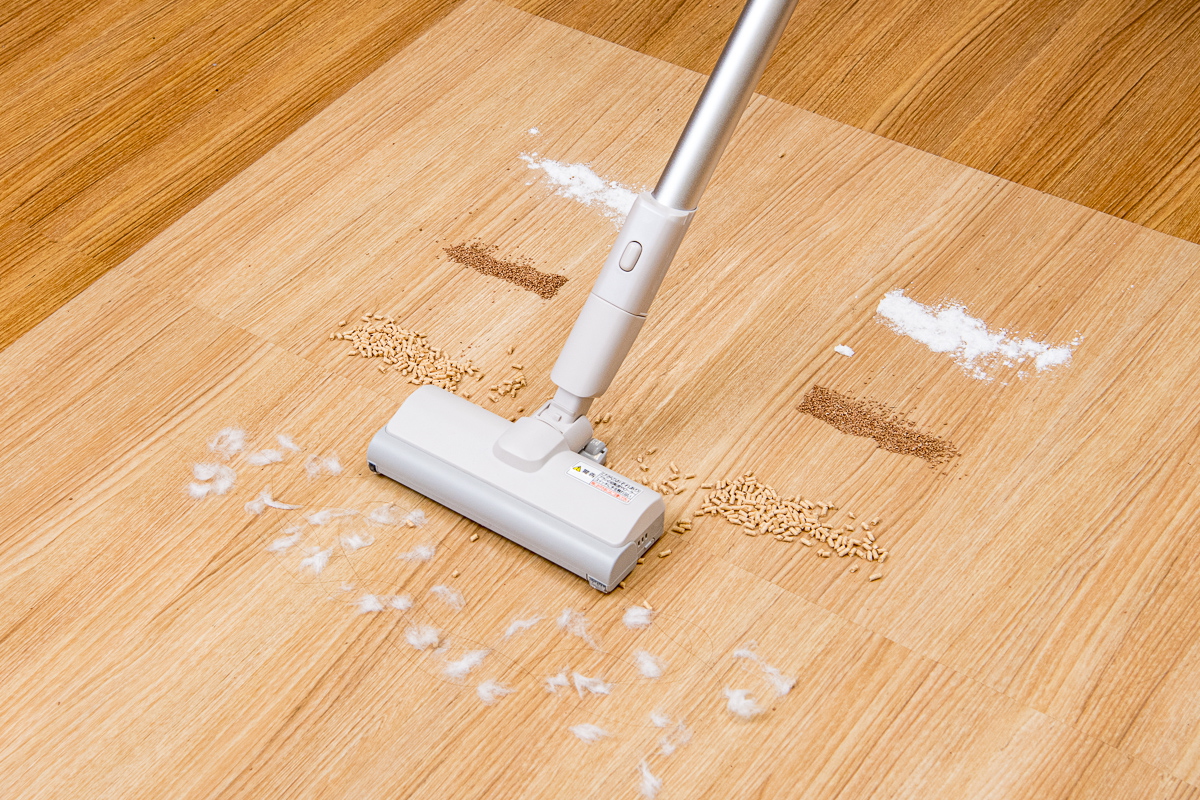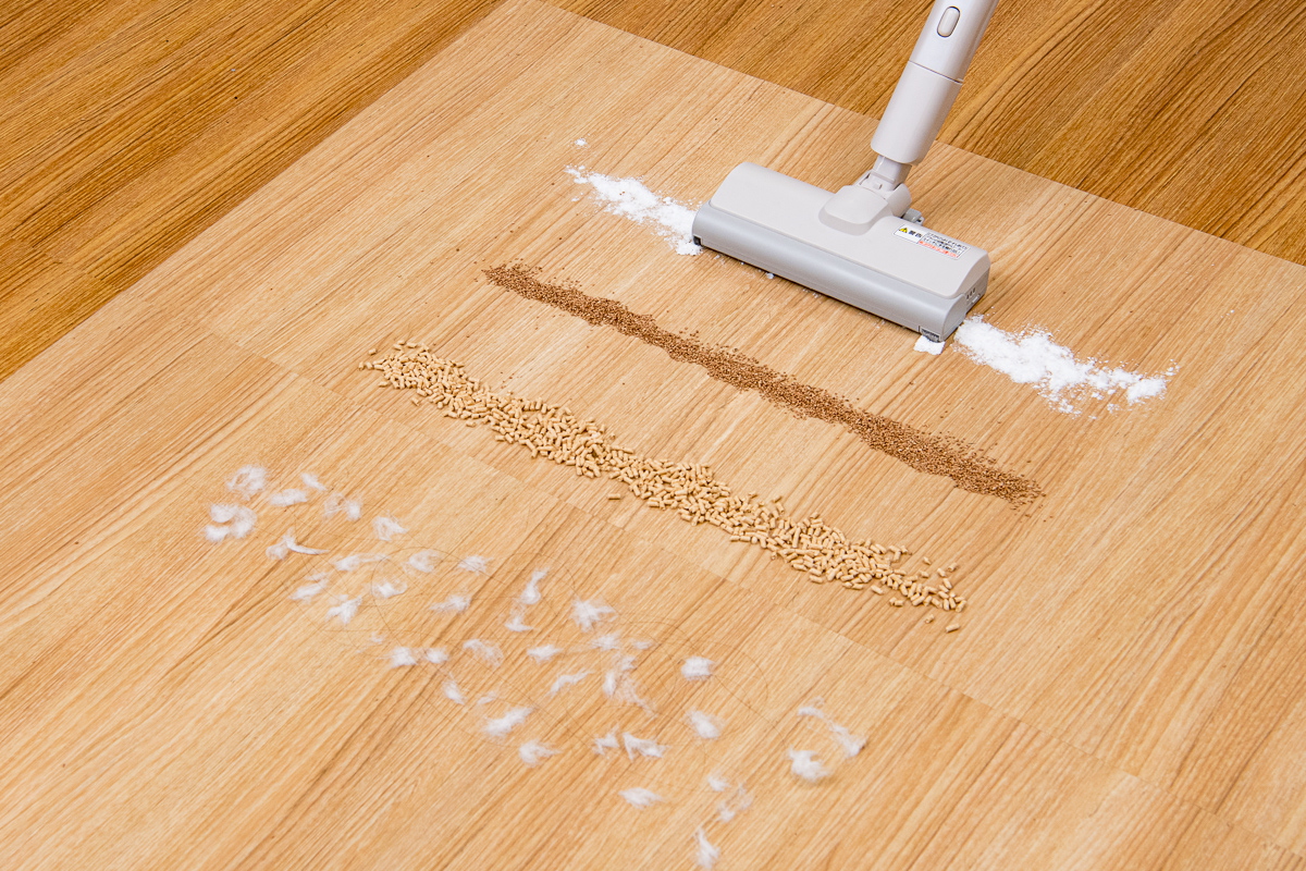 今回のテストでは、フローリング上とカーペット上でのゴミの除去具合をチェック。それぞれの床面に重曹、コルクパウダー、猫砂、脱脂綿+人工毛を順番に置き、それぞれを1ストロークでどれくらい除去できるか検証しました。