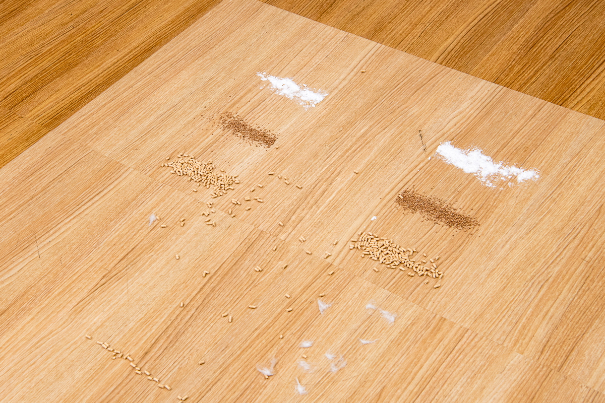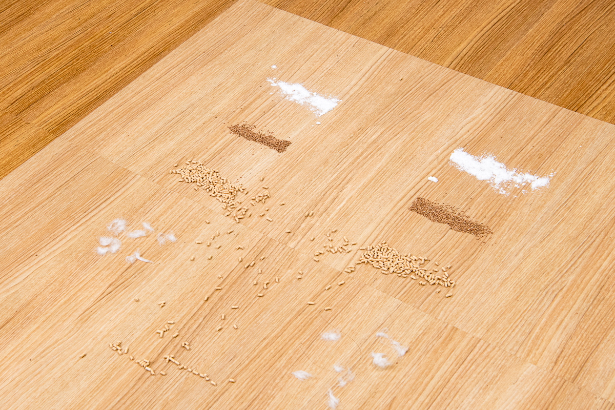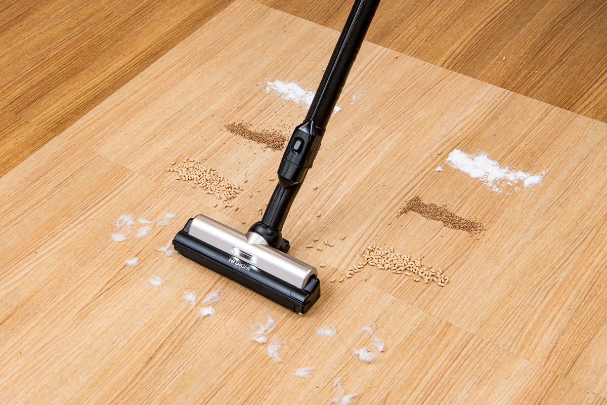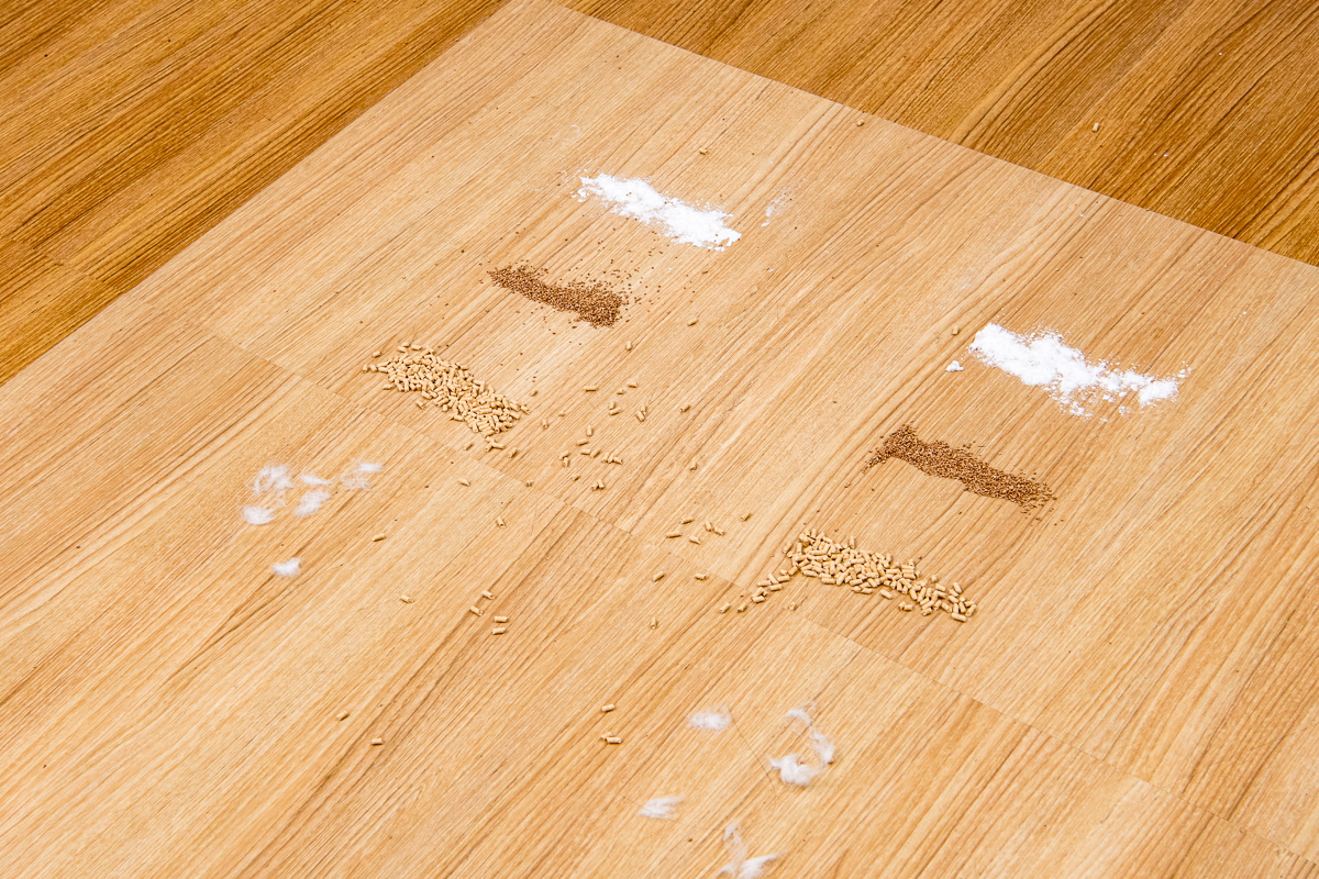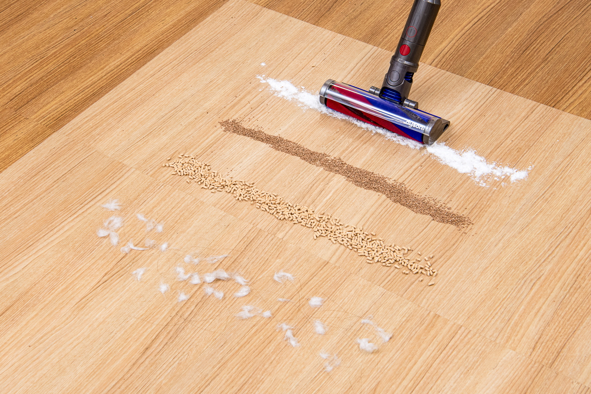 今回のテストでは、フローリング上とカーペット上でのゴミの除去具合をチェック。それぞれの床面に重曹、コルクパウダー、猫砂、脱脂綿+人工毛を順番に置き、それぞれを1ストロークでどれくらい除去できるか検証しました。