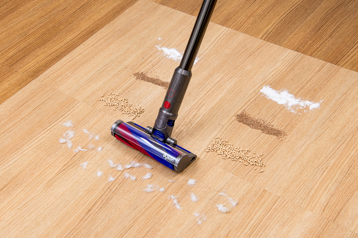 「標準モード」でテスト。猫砂がわずかに取りきれずに残っているほかは、すべてのゴミを除去できていました。また、ヘッドが通過した端から端まで残さず重曹が取れていることに注目できるでしょう。ヘッドは中央の吸込口付近が最も吸引力が強く、端のほうになるほど吸引力が落ちるため、掃除機によっては端に微細なゴミの取り残しが残るものですが、その点Dyson Micro 1.5kgはしっかり重曹が除去できていました。