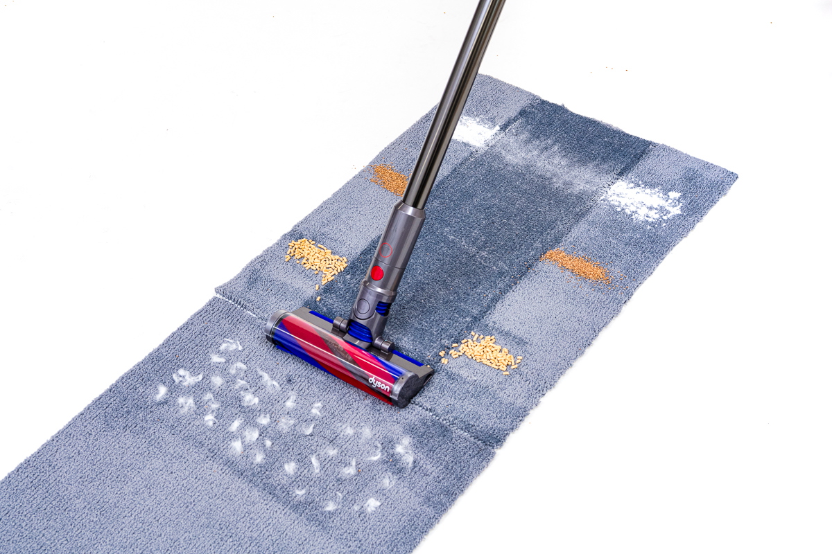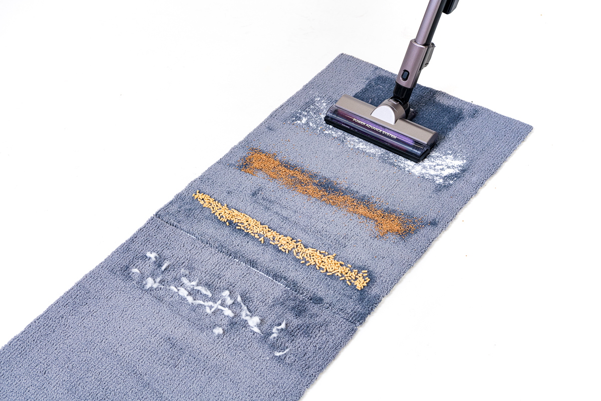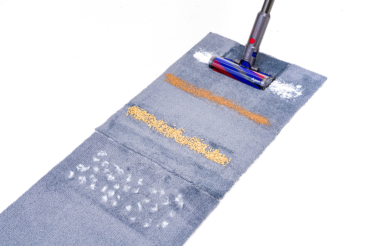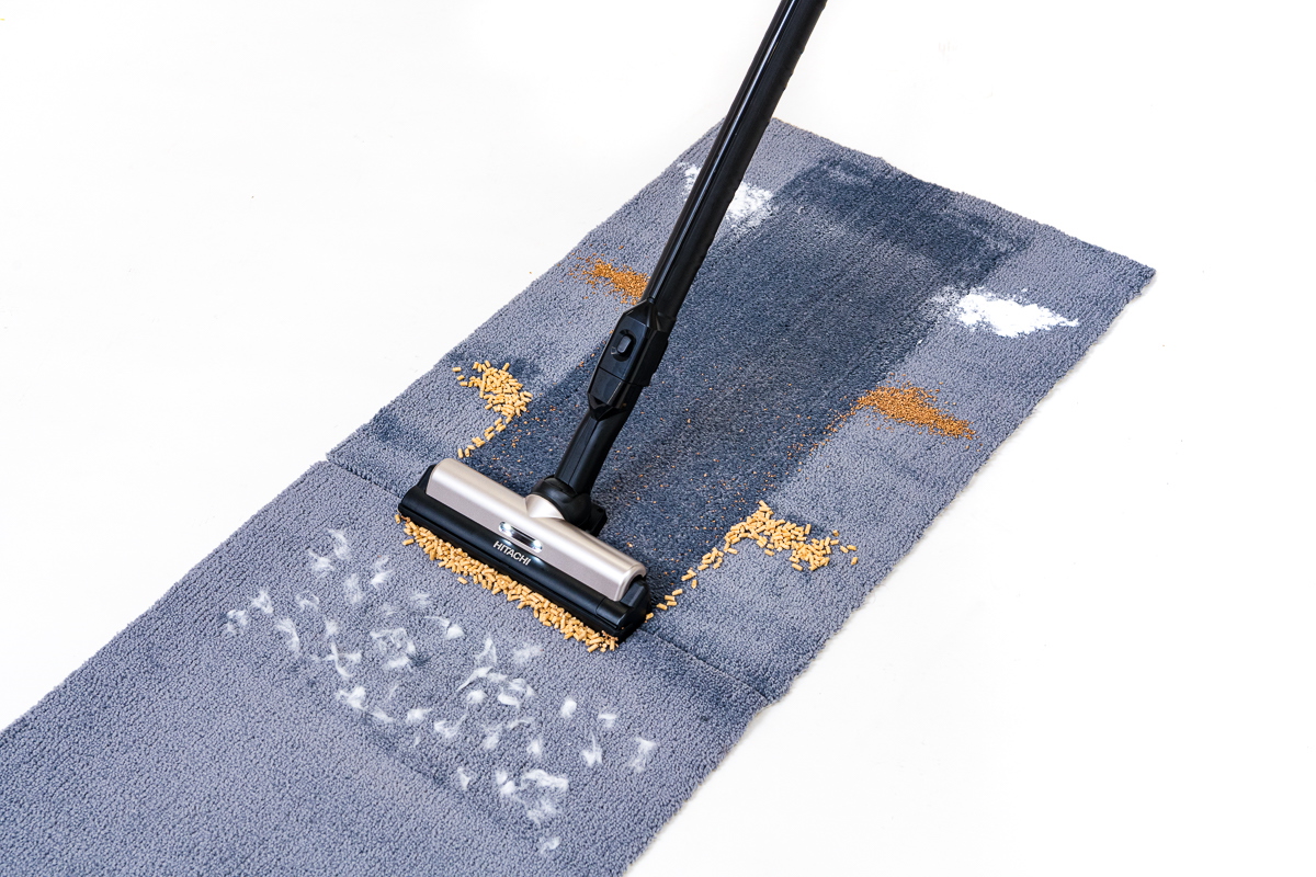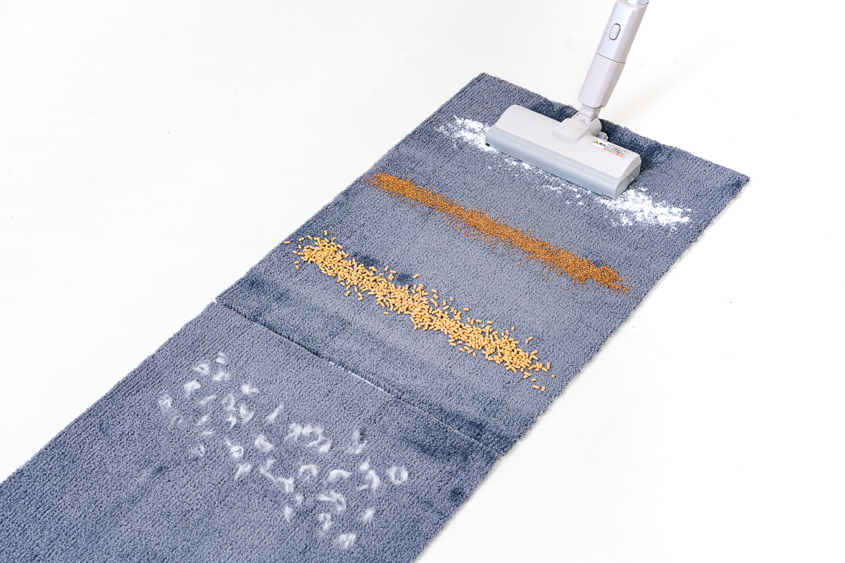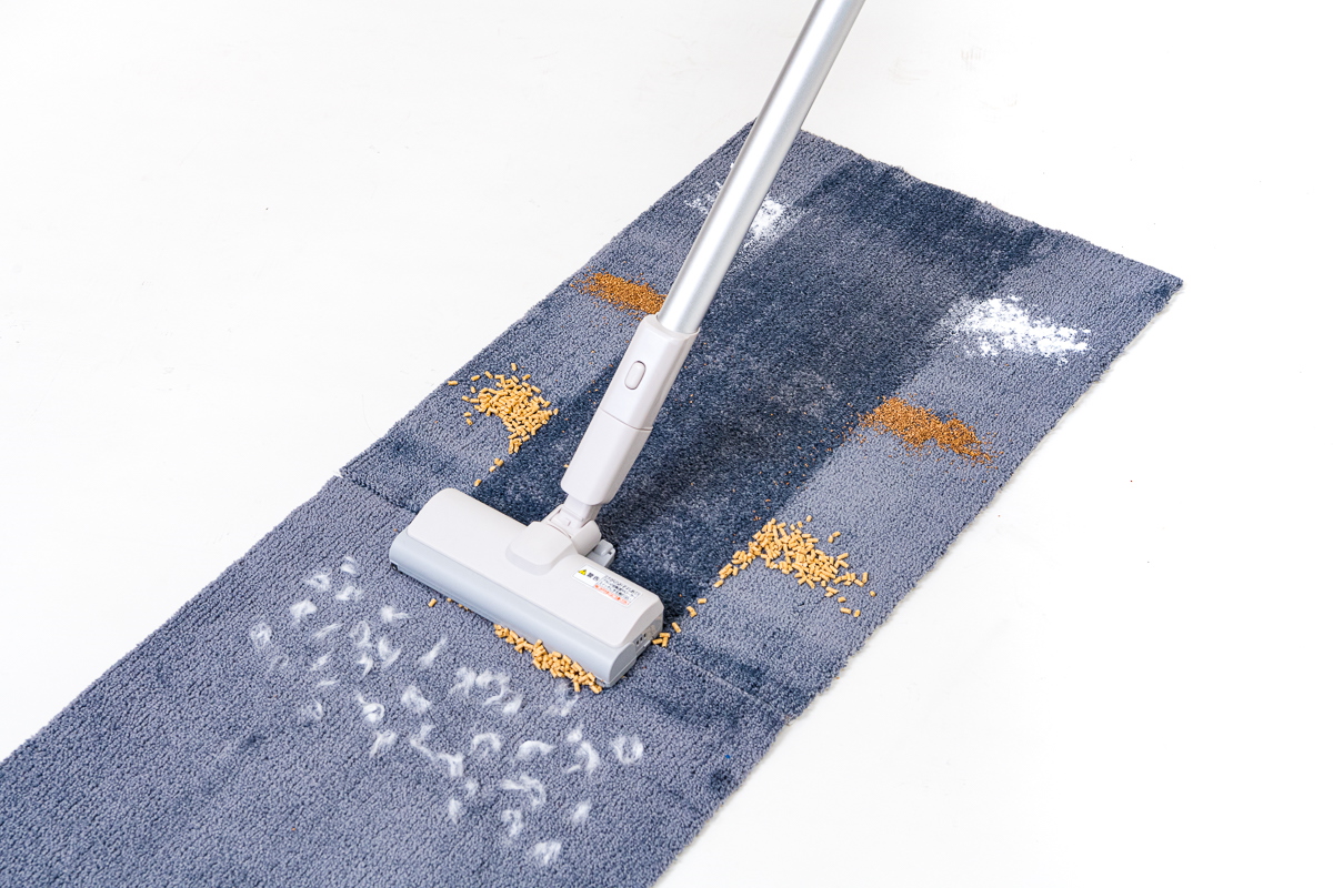 続いて、カーペット上でのゴミ取り性能をチェックしてみました。カーペット上では繊維の奥に潜るゴミも多いため、その掃除機で最も吸引力の強いモードを基本にテストしました。