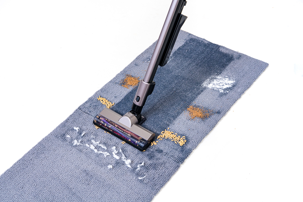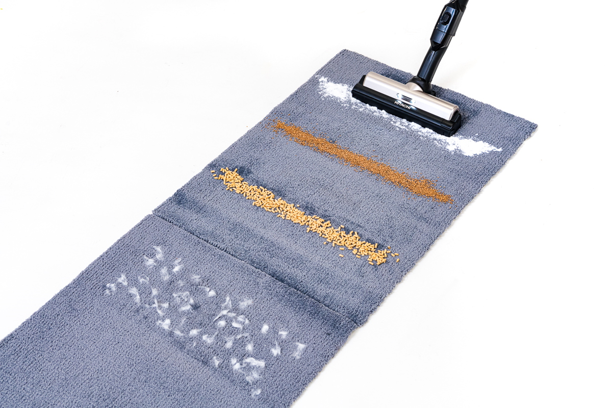 フローリングに関して優秀だったのはDyson Micro 1.5kg。特にゴミのなかでもサイズが大きい猫砂の捕集に威力を発揮していました。ただ、猫砂以外の重曹やコルクパウダー、脱脂綿など小さいゴミ、軽いゴミの吸引では他モデルも十分なパワー。シャープEC-AR5X、アイリスオーヤマSCD-L1P-Bは重曹もコルクパウダー、脱脂綿、髪の毛をほぼ完璧に除去。パナソニックMC-SB51Jはヘッドが通過した端の部分に重曹がわずかに残る程度でした。また、日立PV-BL2Hはヘッドの端が通過した部分に重曹が少し残ったほか、コルクパウダーをわずかに弾いて取り逃がしていました。ただし、それらはもう一度ヘッドで吸えばすぐ取り切れるので、実際の掃除ではまったく問題ないでしょう。