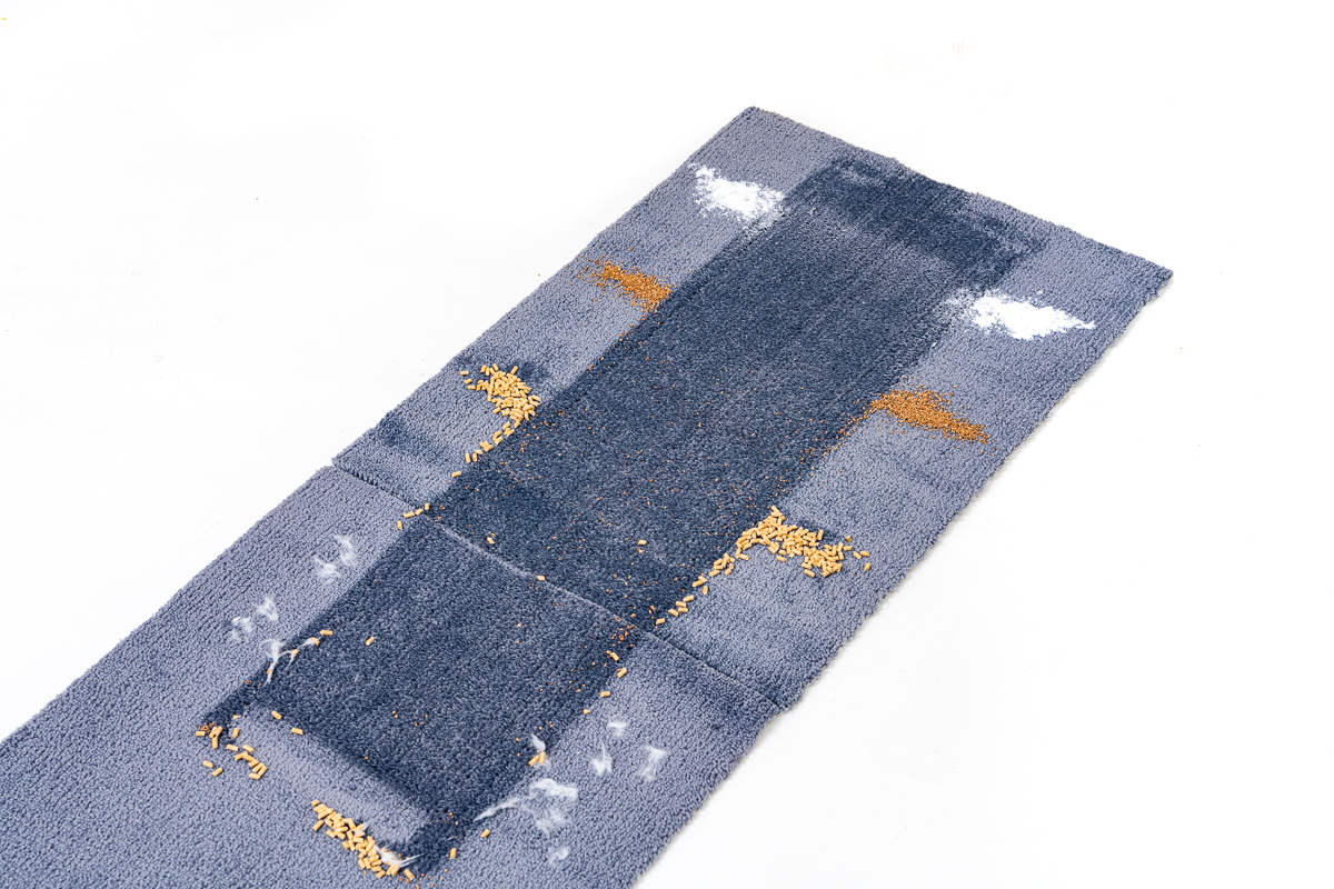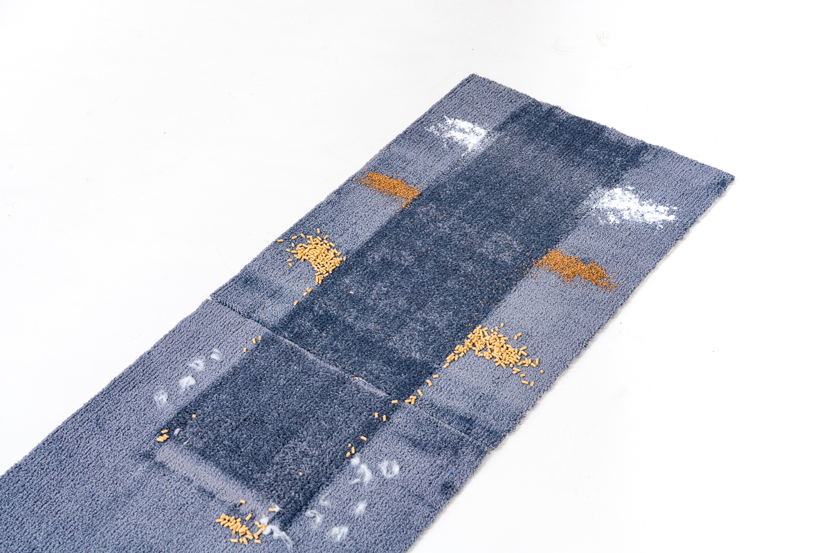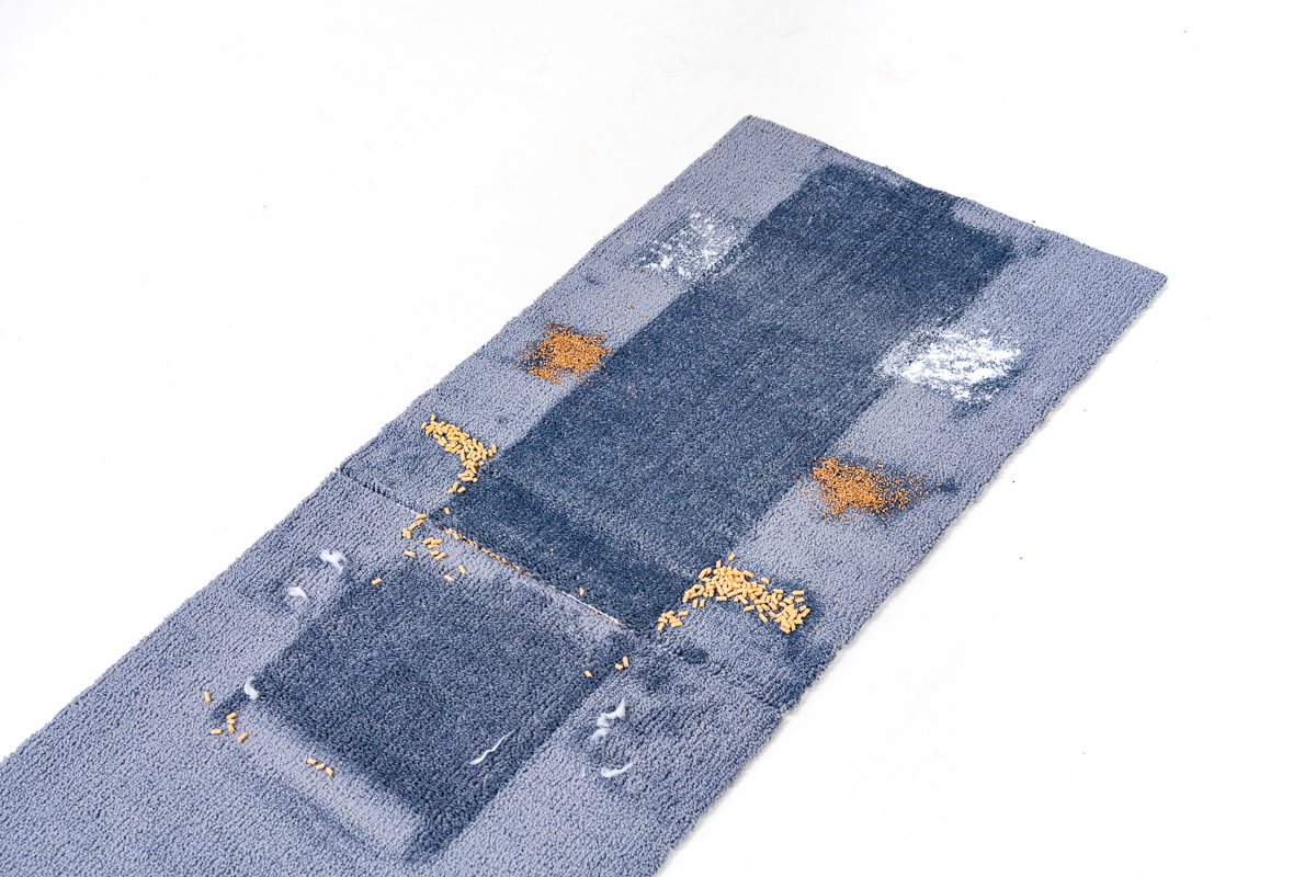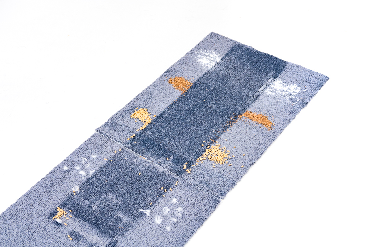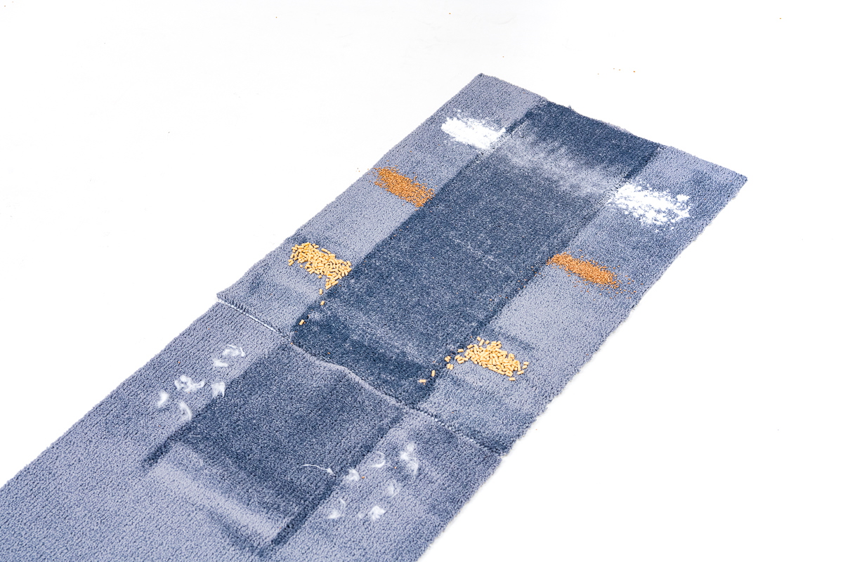 今回のテストでは、フローリング上とカーペット上でのゴミの除去具合をチェック。それぞれの床面に重曹、コルクパウダー、猫砂、脱脂綿+人工毛を順番に置き、それぞれを1ストロークでどれくらい除去できるか検証しました。