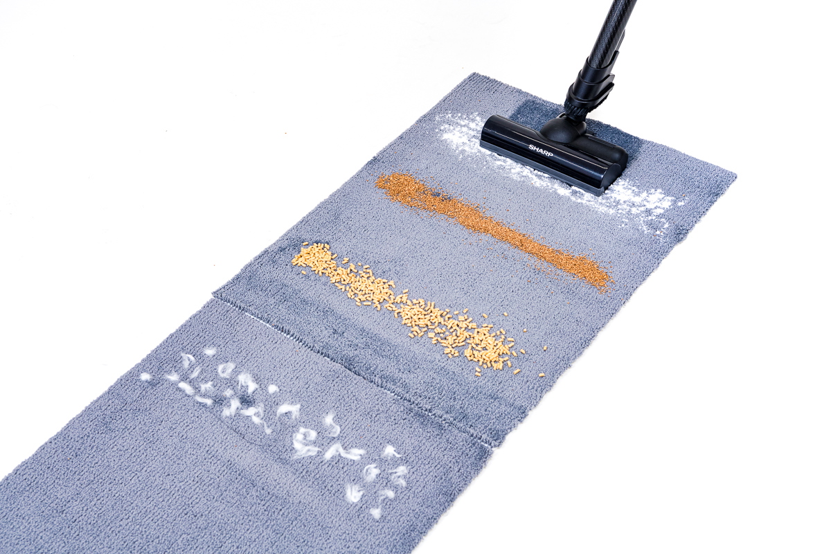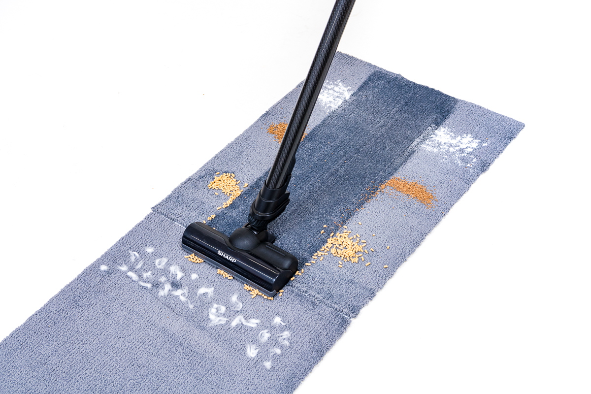 一方カーペットの掃除では、ブラシ毛を採用しないDyson Micro 1.5kgは重曹の除去がうまくできませんでした。逆にブラシ毛採用の4モデルは重曹の除去は比較的良好で、特にシャープ EC-AR5X、次いでパナソニック MC-SB51J、アイリスオーヤマ SCD-L1P-Bでよく重曹が取れていました。他方、猫砂についてはほとんどを取り切ったダイソンが相変わらず有利。パナソニックもヘッドが通過したあとは端の部分を除きほとんどの猫砂を除去できていました。