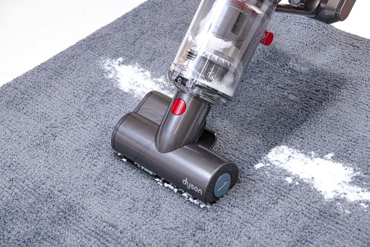ちなみに、同機には「ミニモーターヘッド」という付属ツールが同梱されています。これはふとんやソファなどの掃除に使う小型のパワーブラシなのですが、こちらはブラシ毛を採用しています。通常のソフトローラークリーナーヘッド(Micro Fluffyクリーナーヘッド)で苦手だったカーペットでの重曹で吸引テストをしてみました。