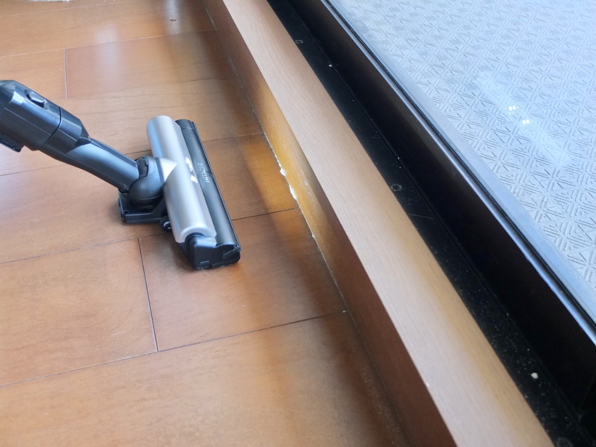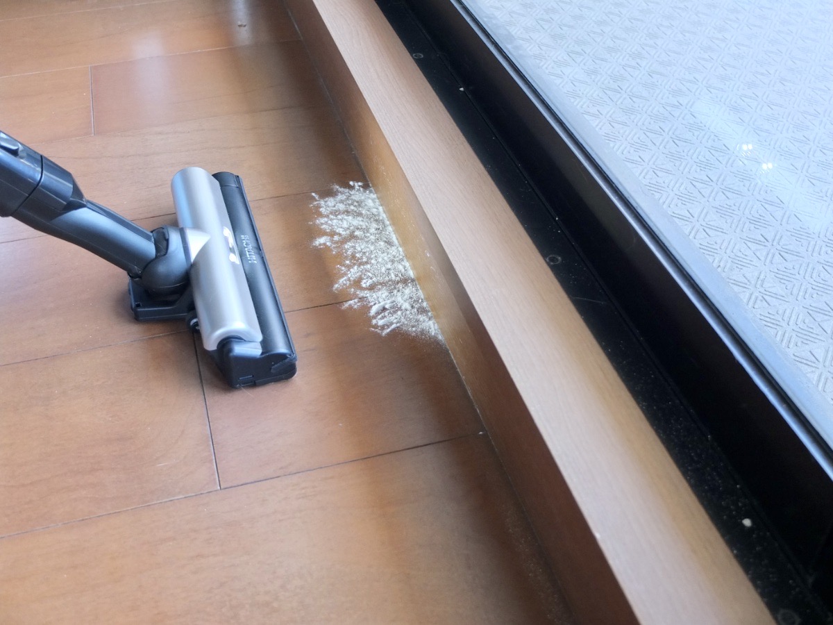 壁際の掃除は、標準モードだと床と壁の間に重曹が少し残ってしまいました。シャープやパナソニックに比べると、取り残しがやや多かった印象です。強モードだと、壁の下のすき間に入り込んだ重曹のみうっすら残ったものの、ほぼ吸引・除去できていました。壁際のゴミ取り能力はまずまずといえるでしょう。