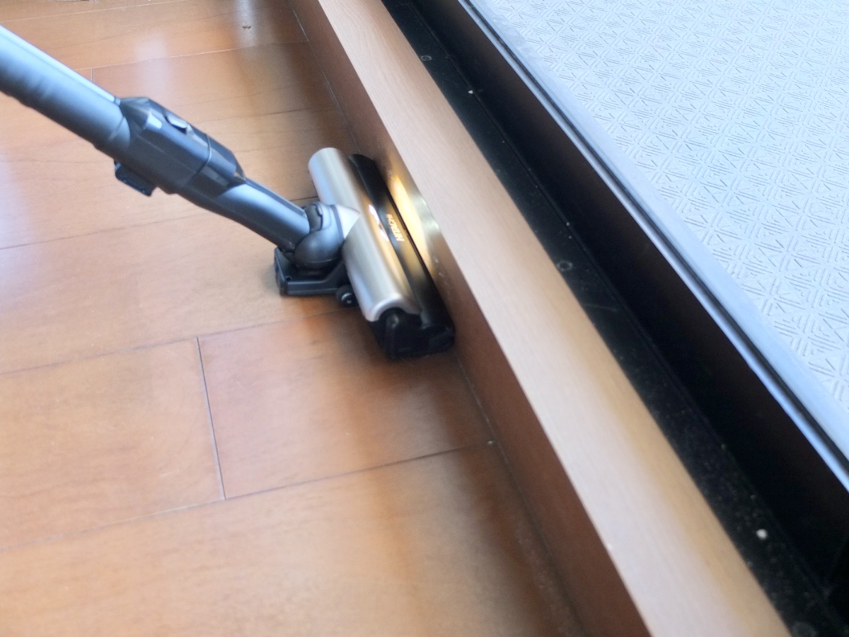 高さのない場所でも、本体をペッタリ床につけてヘッドを突っ込み、ラクラク掃除できました。ヘッドの前後幅が小さく、壁と家具のすき間などにも横向きにして入れることができるので、サクサク掃除できます。