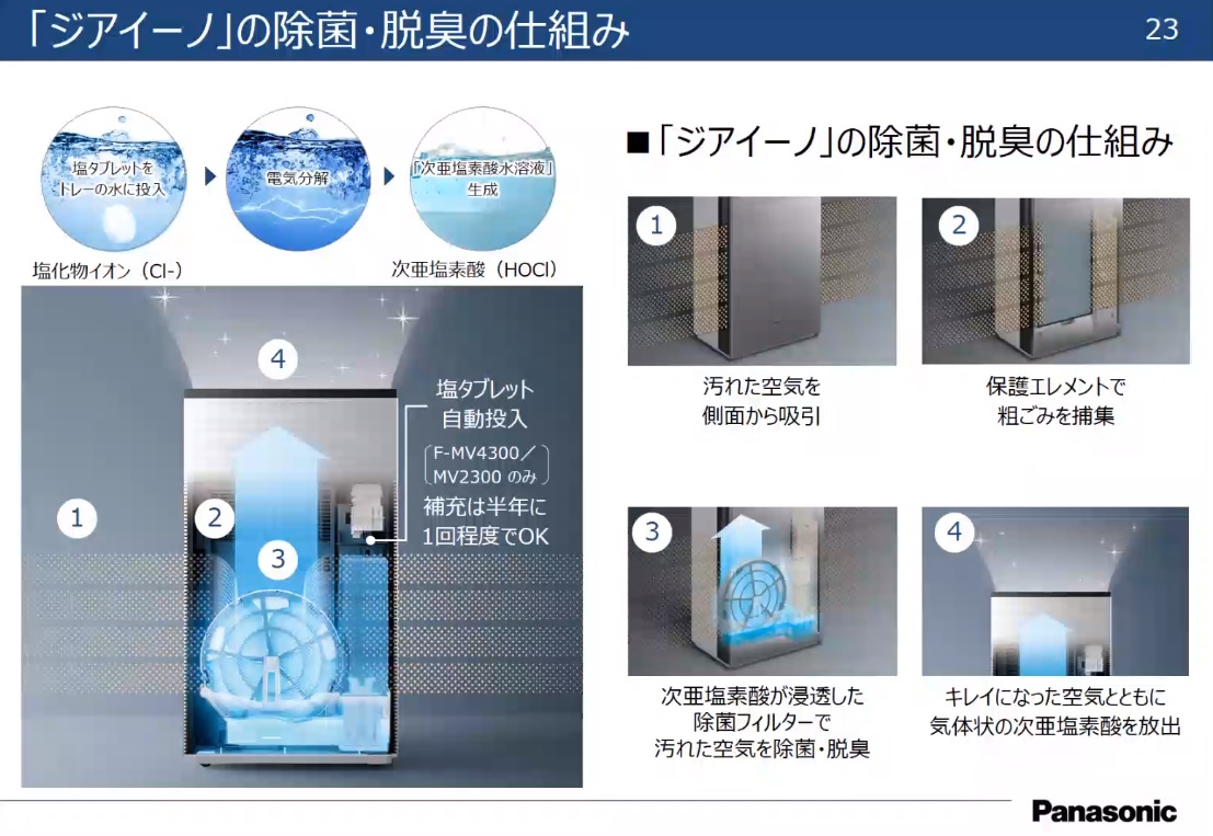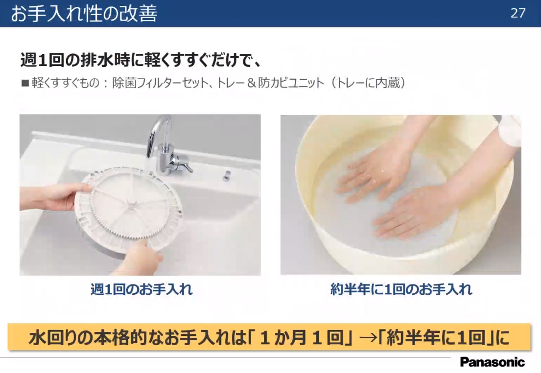 このほか、本体のお手入れ性を改善し、週1回の排水のときに除菌フィルターやトレーをすすぐだけで、本格的なお手入れは従来の月1回から半年に1回に減らすことが可能です。
