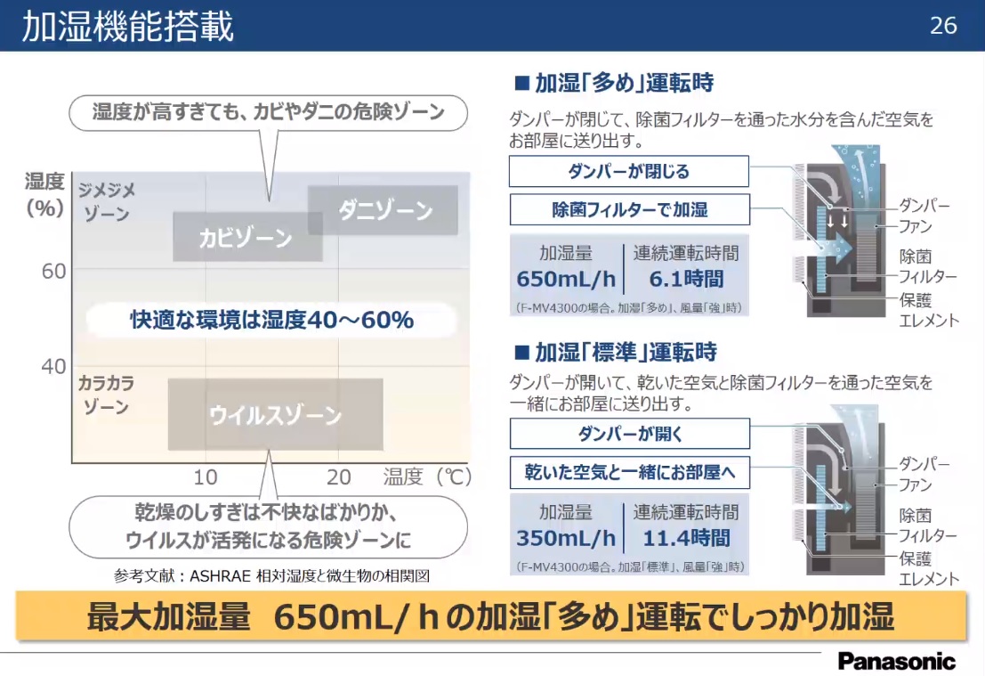 また、本体のダンパーを閉じてフィルターを通った湿った空気だけを放出することで、加湿機能を高めた「加湿多め運転」モードを新たに搭載。乾燥が気になる季節も加湿しながら除菌・脱臭することができます。