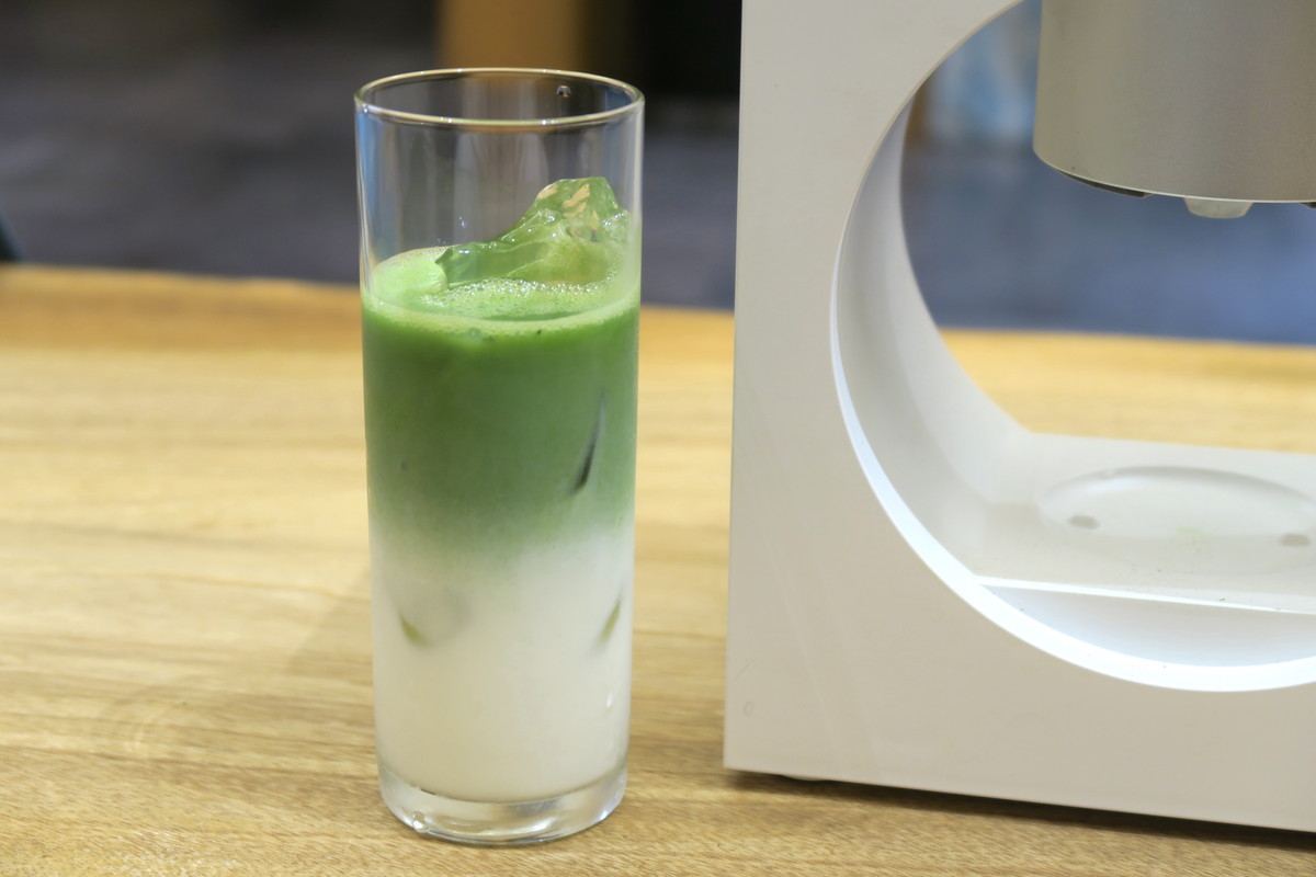 Cuzen Matchaで作った抹茶は、十分な濃さがあるのでほかの飲み物と混ぜるのもオススメ。たとえば、氷を入れたグラスに冷たいミルクを注ぎ、濃さレベル2か3の抹茶ショットを注げば「抹茶ラテ」が完成!