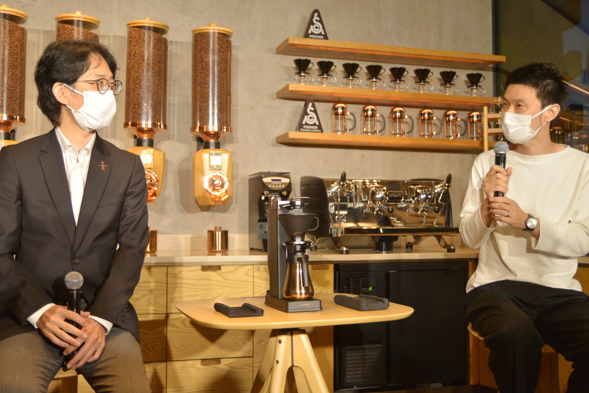 体験会の前半は、両社の責任者によるトークセッション。スターバックスジャパンのコーヒースペシャリスト・江嵜讓二さんと、バルミューダの商品設計部・太田剛平さんが開発秘話などを語りました。