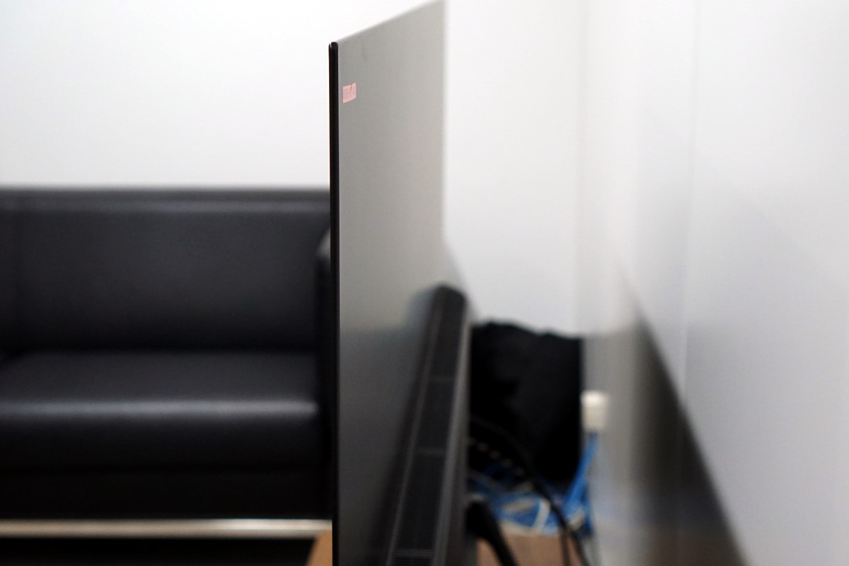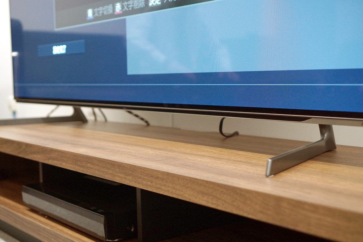 同シリーズは有機ELパネルの周辺を保護するベゼル(額縁)をとてもスリムにデザインしたテレビです。まるで映像が宙に浮いているかのような効果を追求するだけでなく、カバーガラスの周辺をしっかりと保護するようにフレームで覆い、万一テレビが転倒した場合にもパネルが破損しないように安全性を熟慮しています。デスクトップスタンドは色をガンメタリックとしてリビングの風景に自然と溶け込ませます。