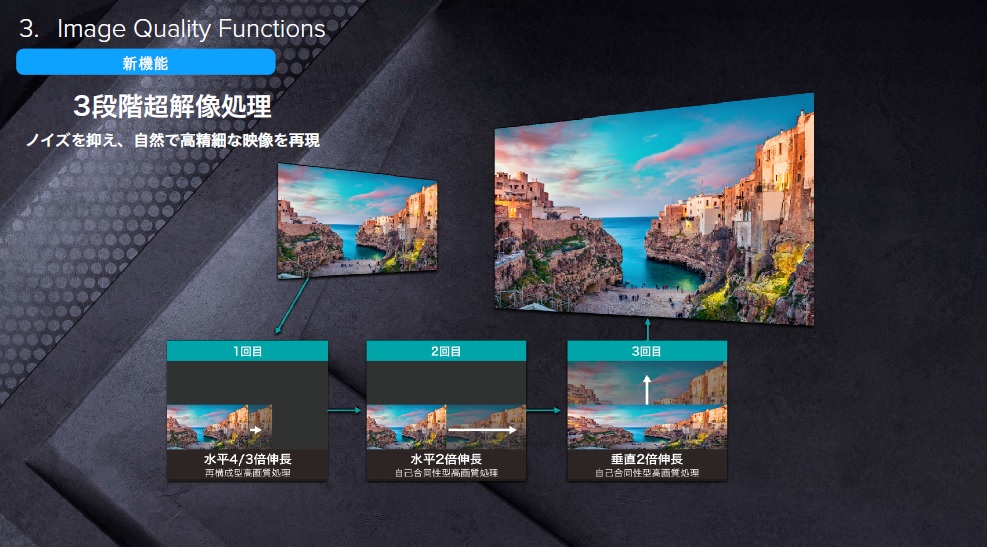 最新のエンジンでは、新たに3段階の超解像処理機能が加わりました。地デジや2KのBS/CS放送を複数の段階で4K解像度にアップコンバートしてX8Fの画面に映し出すまで、複数の行程でノイズを低減しながら精細感のある映像に変換します。地デジのバラエティ番組を視聴してみると、被写体となる人物を立体的に浮かび上がらせながら、肌は滑らかに描き分ける超解像エンジンの“賢さ”が良くわかります。