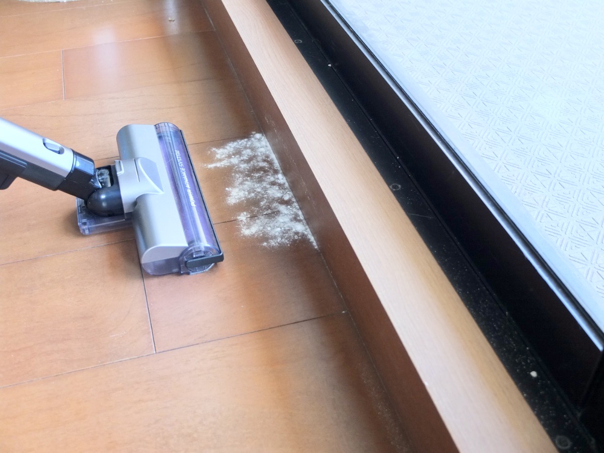 壁際の掃除は、自動モードだと床と壁の間にやや多めに重曹が残ってしまいました。一方、ターボモードではわずかに取り残しがあったものの、壁と床のすき間に入り込んだ重曹もほとんど取り切っていました。