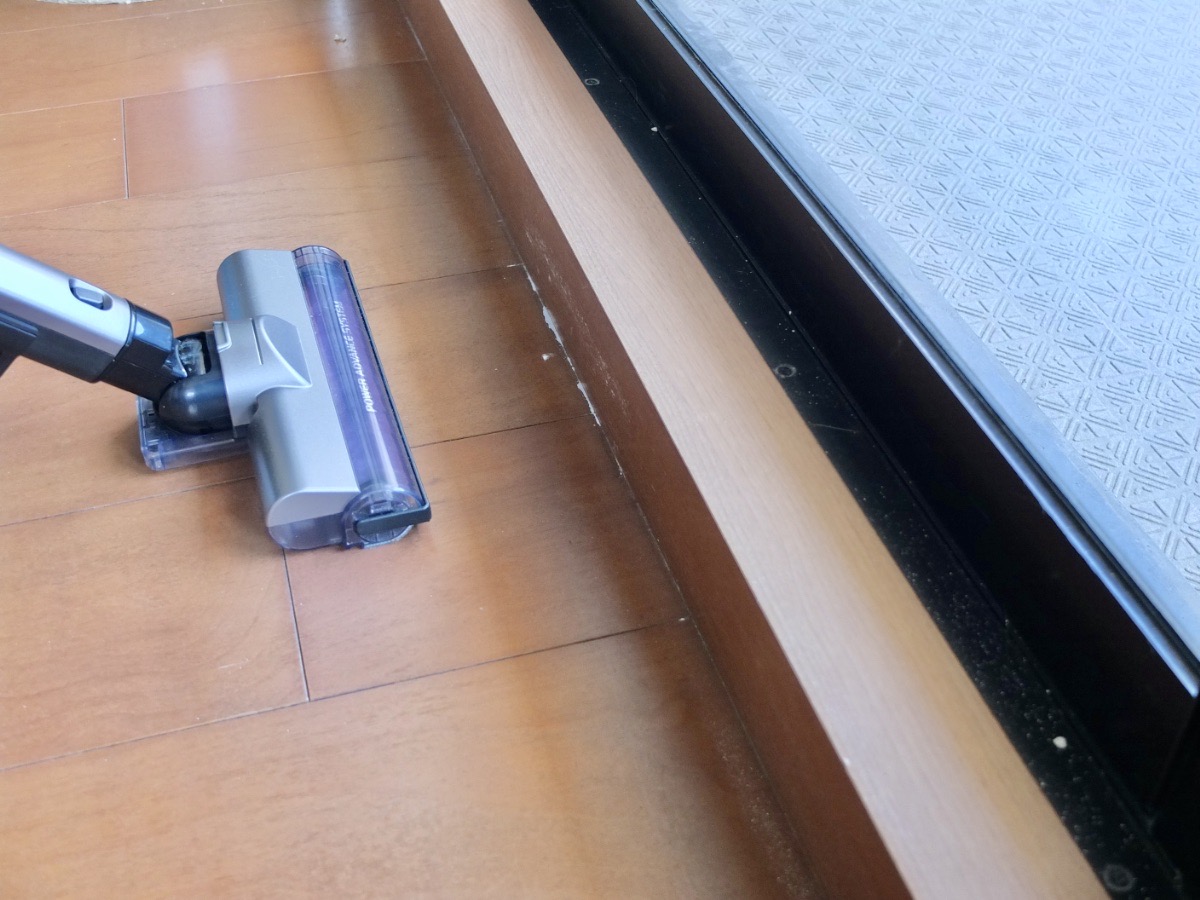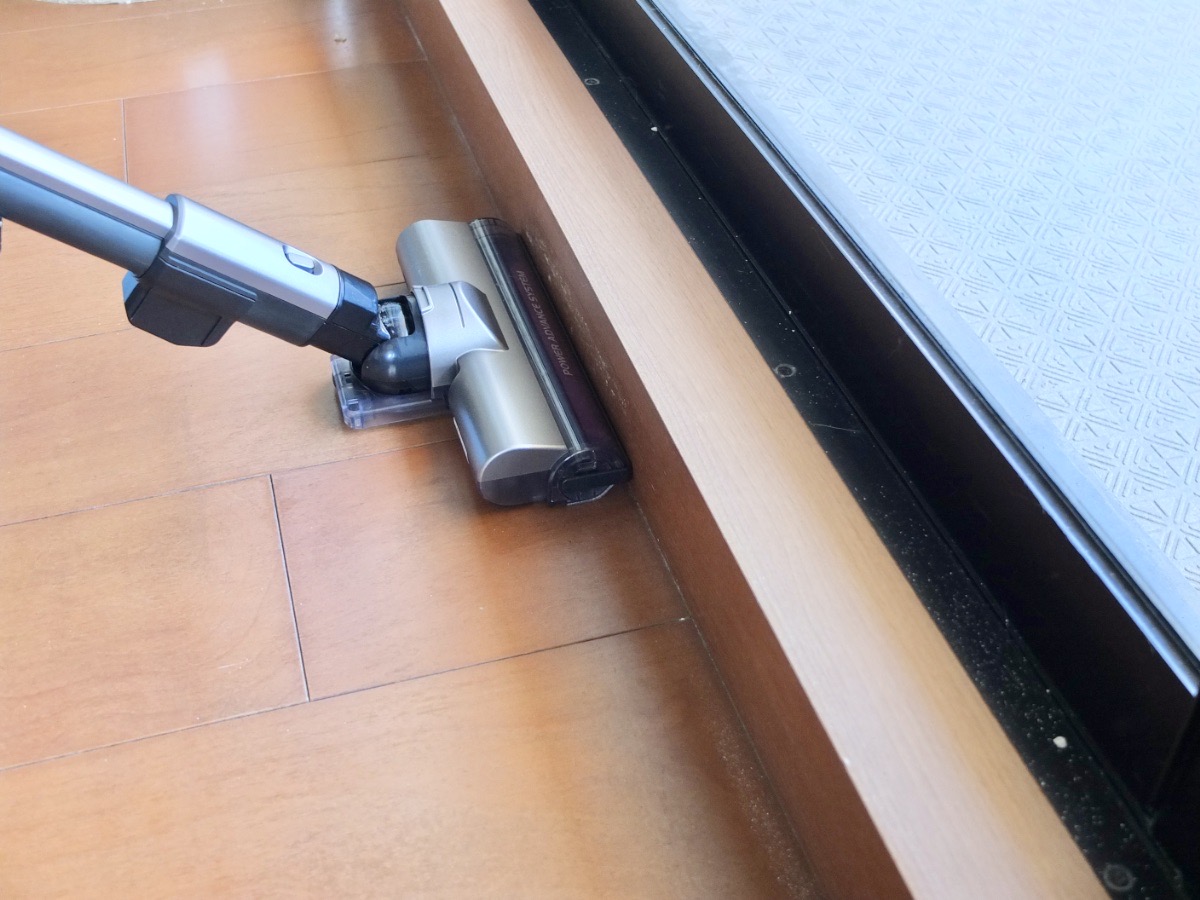 標準質量は1.4kgで、ヘッドブラシは自走性が高く、操作感は軽快です。ただ、他の4機種と比べると、ヘッドの左右の首振りの際にわずかなぎこちなさを感じました。本体が床にペタッとつくので、家具下など高さのないスペースの掃除もスムーズです。ベッド下などでの首振りは、本体位置を下げながら徐々に左右に振ればOK。方向を変えるときは一度ヘッドを外に出すことで問題なく行えました。