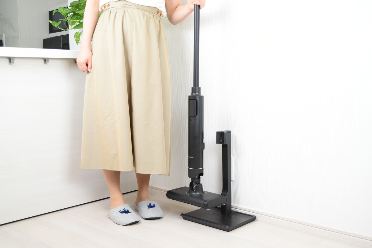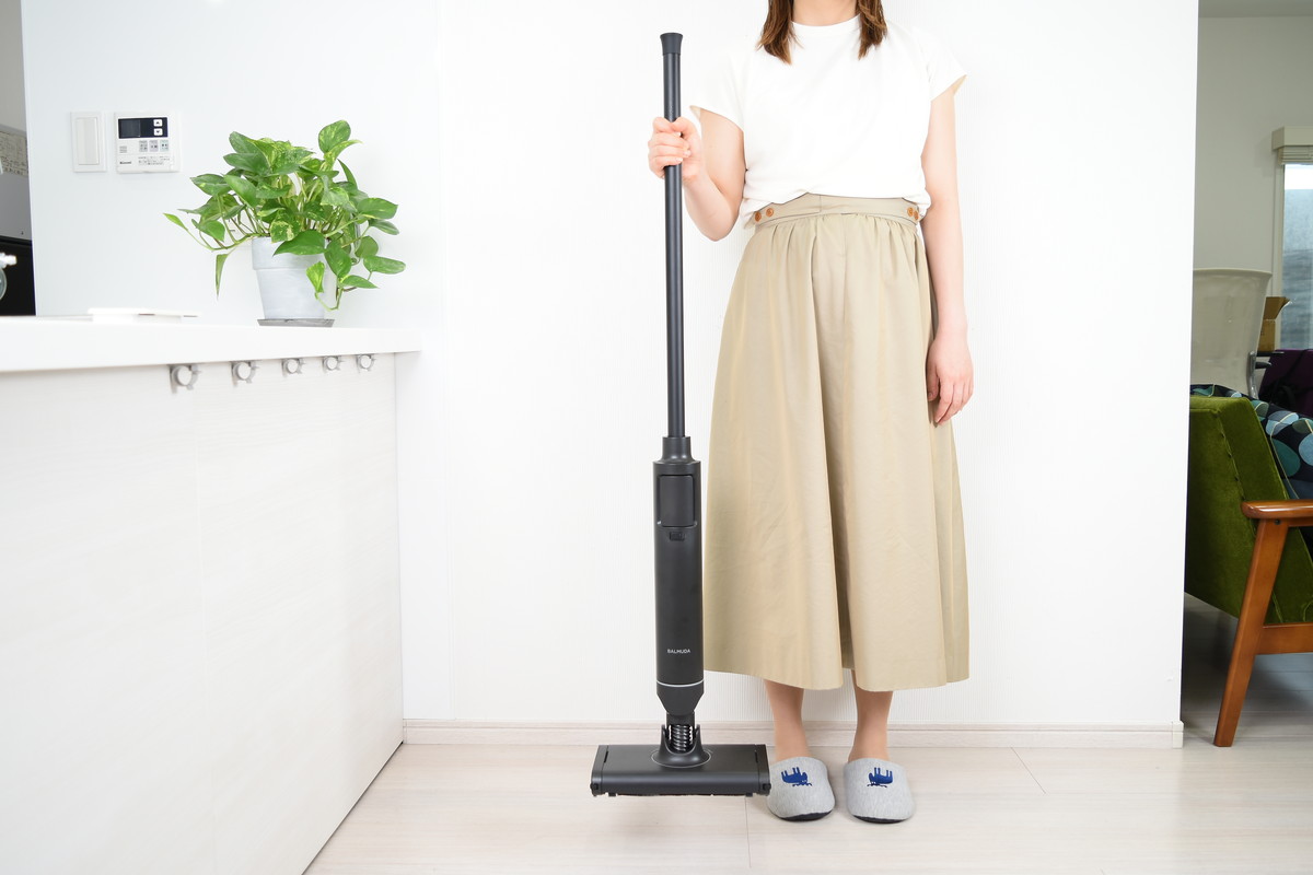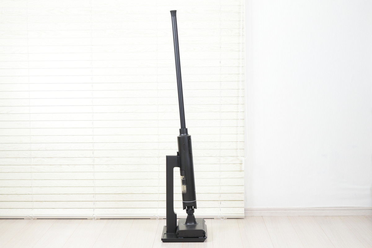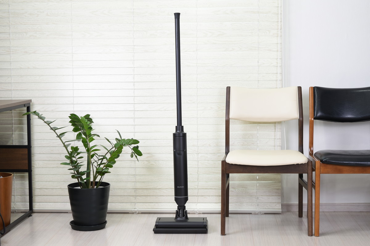 余計な装飾を排したミニマルなデザインは「BALMUDA The Cleaner」を踏襲しており、バルミューダ製品らしい洗練された雰囲気が漂う。本体を充電スタンドにセットすると、本体がわずかに後傾する点も従来モデルと同様。使わない時間の方が長いクリーナーだからこそ、立てかけている姿も美しくなるよう設計されている。