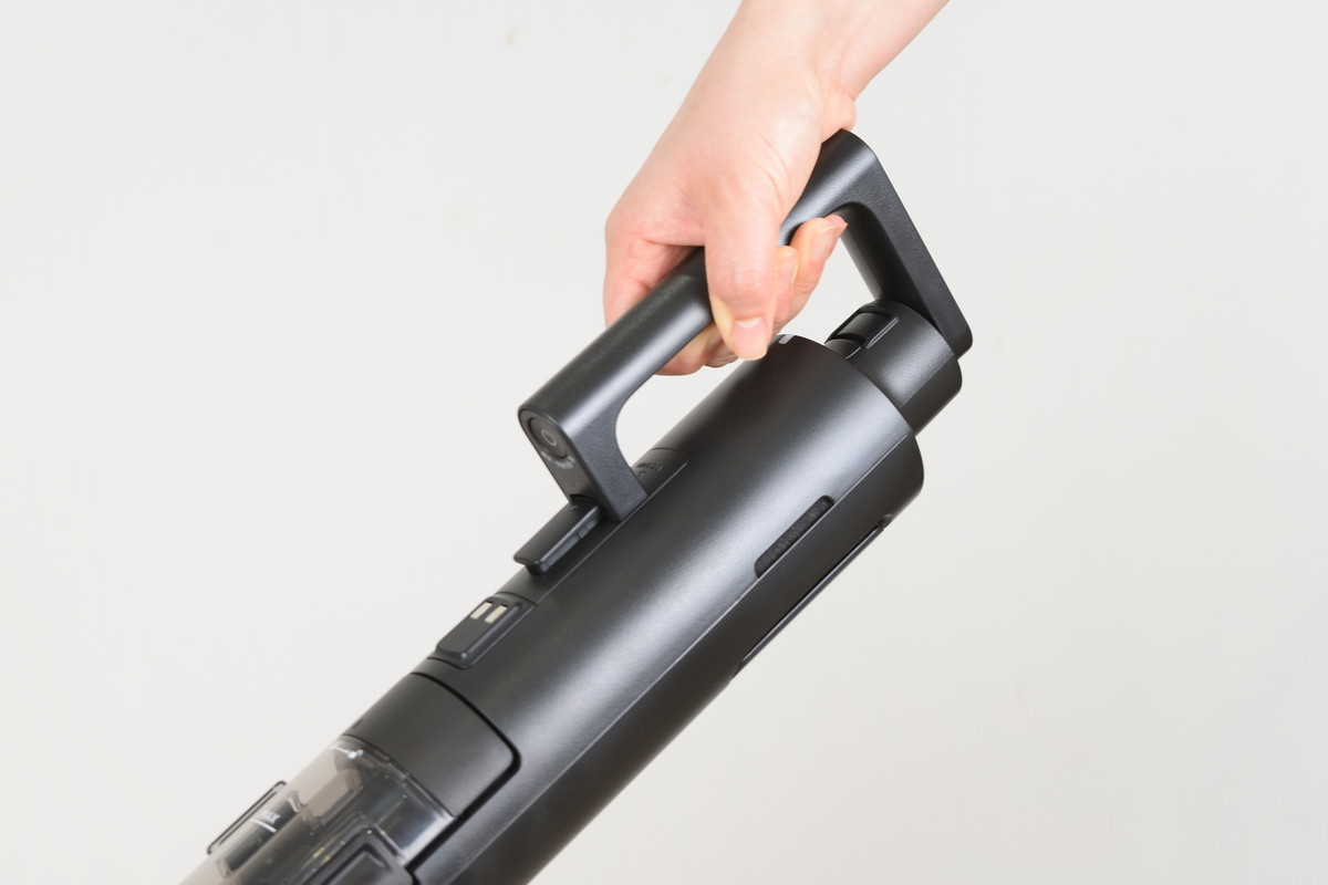 「ホバーテクノロジー」によって重さを感じさせない「BALMUDA The Cleaner Lite」。従来モデルでは掃除機を充電スタンドに乗せる時や、電源を切って移動する時など、掃除中以外のシーンで重さを感じる場面があったが、約2.2kgに軽量化された「BALMUDA The Cleaner Lite」ではそれがない。ヒョイッと片手で持ち上げられるので、ちょっとした移動はもちろん、階段掃除なども苦にならなかった。