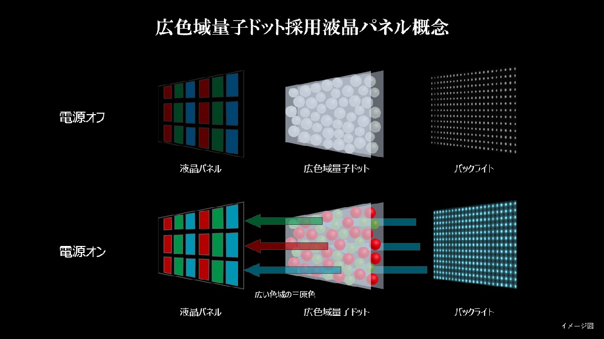 一方、広色域量子ドット搭載モデルでは、青色LEDライトにカラーフィルターを装着せず、青色の光をそのまま広色域量子ドットシートに照射。シートのなかに配された量子ドットが青色の光を赤や緑の光に変換することで、これまでよりもRGBの色純度の高い光を作り出し、RGBカラーフィルターを通ったときにより広色域な色を再現できるというものです。