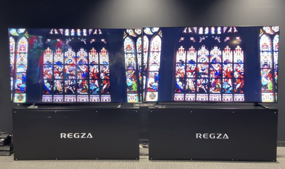 発表会では、白色LEDバックライトを搭載した4K液晶レグザ「M550L」シリーズとZ770Lが並べて展示されていましたが、特に赤や緑の発色の鮮やかさで違いを感じることができました。広色域量子ドットを採用したパネルは、地デジやBS放送の標準規格であるBT.709の色域を超えた色域を表示できるため、放送に際し失われた色域を復元してあげることで、テレビ放送なども従来より色鮮やかな画質で楽しめるとのこと。
