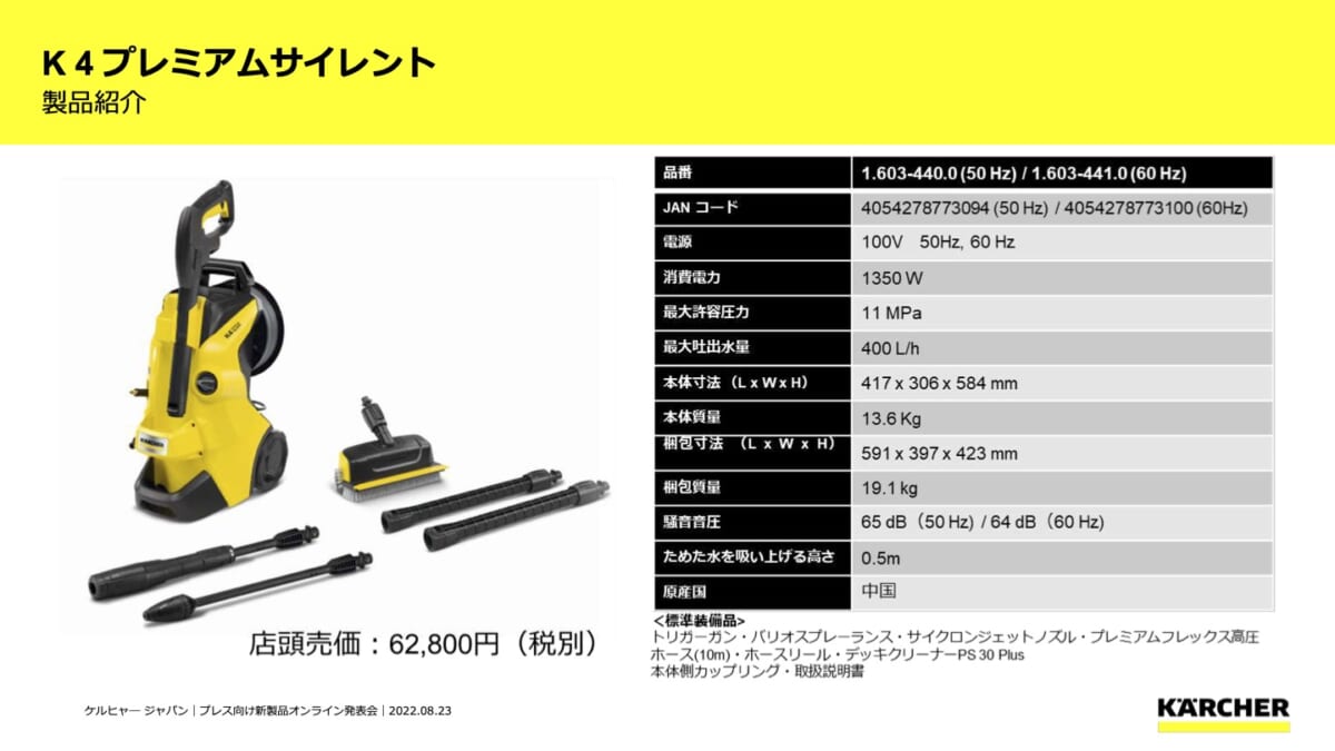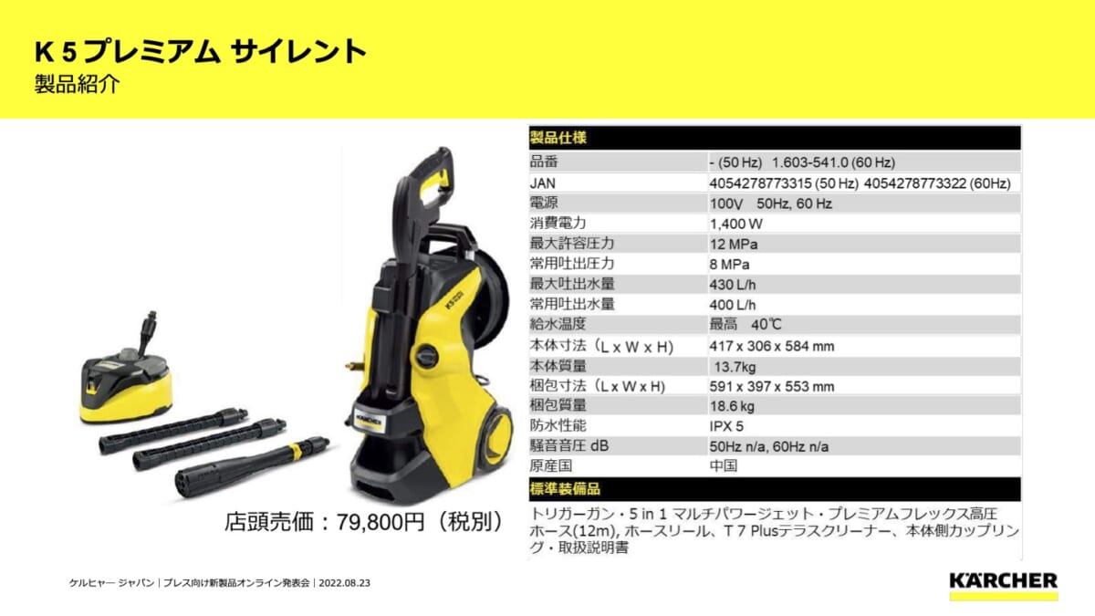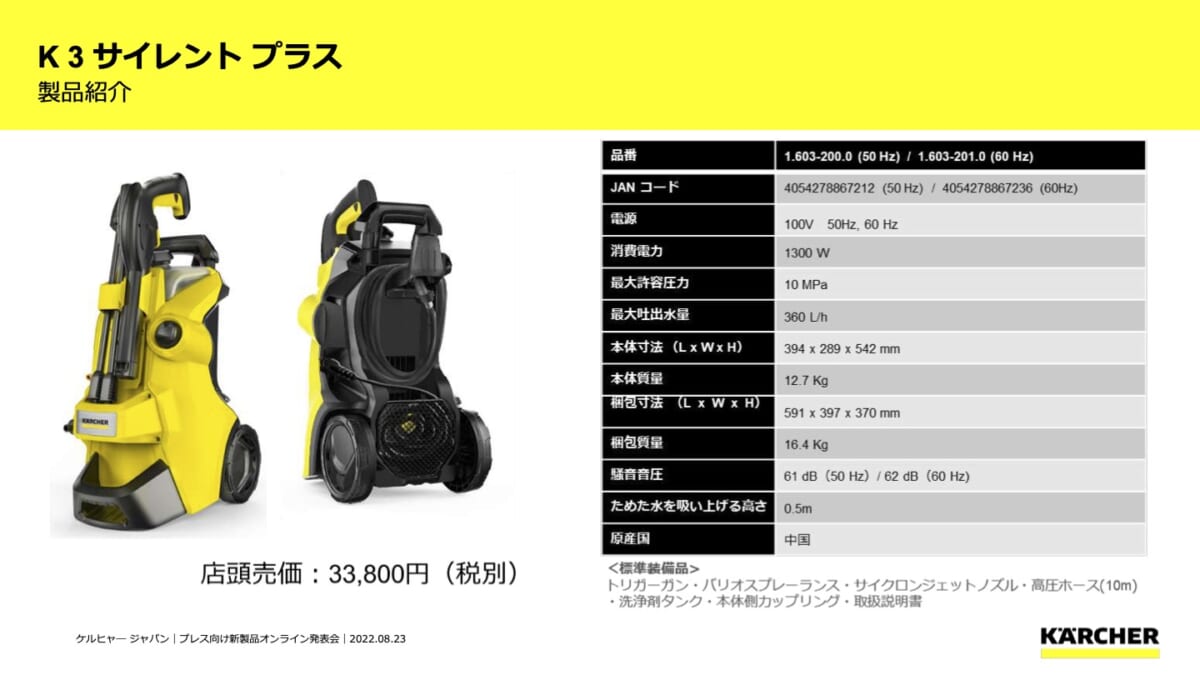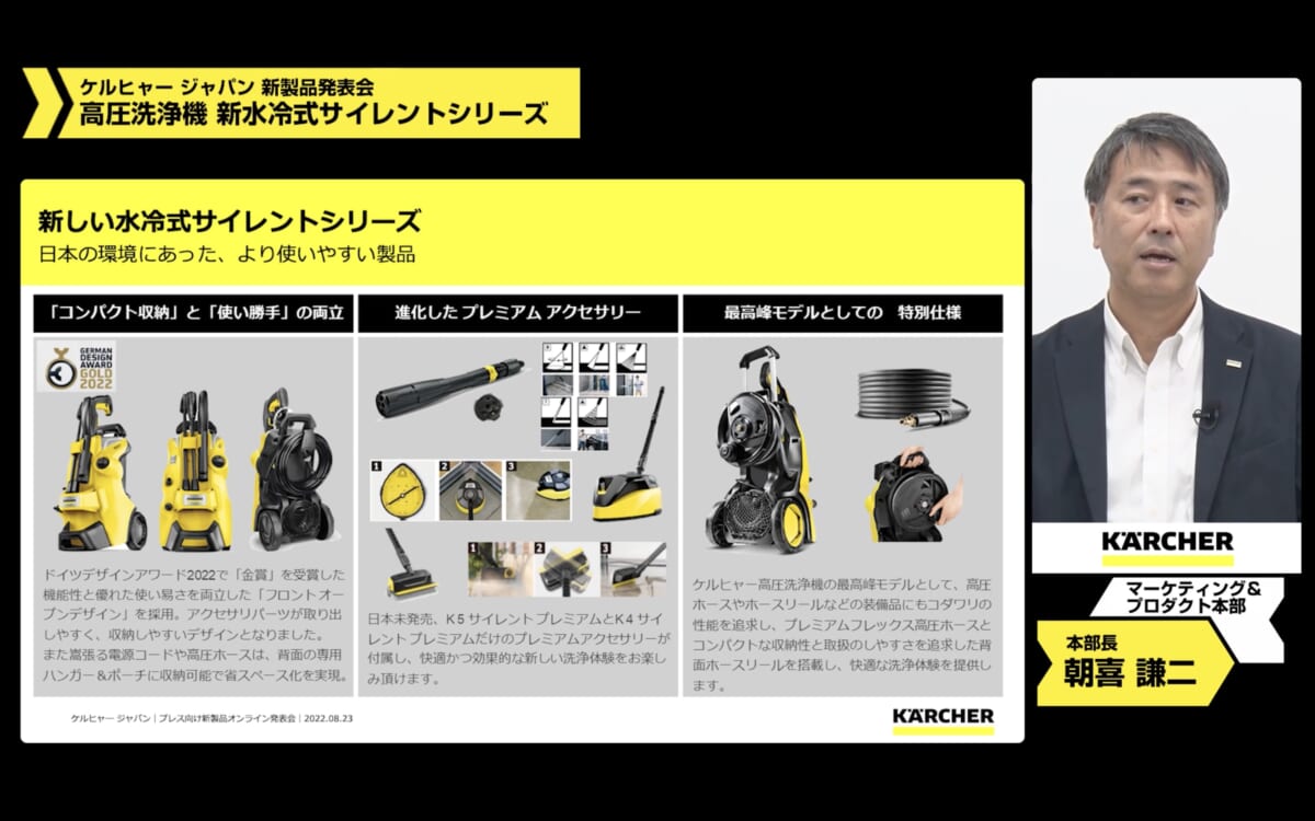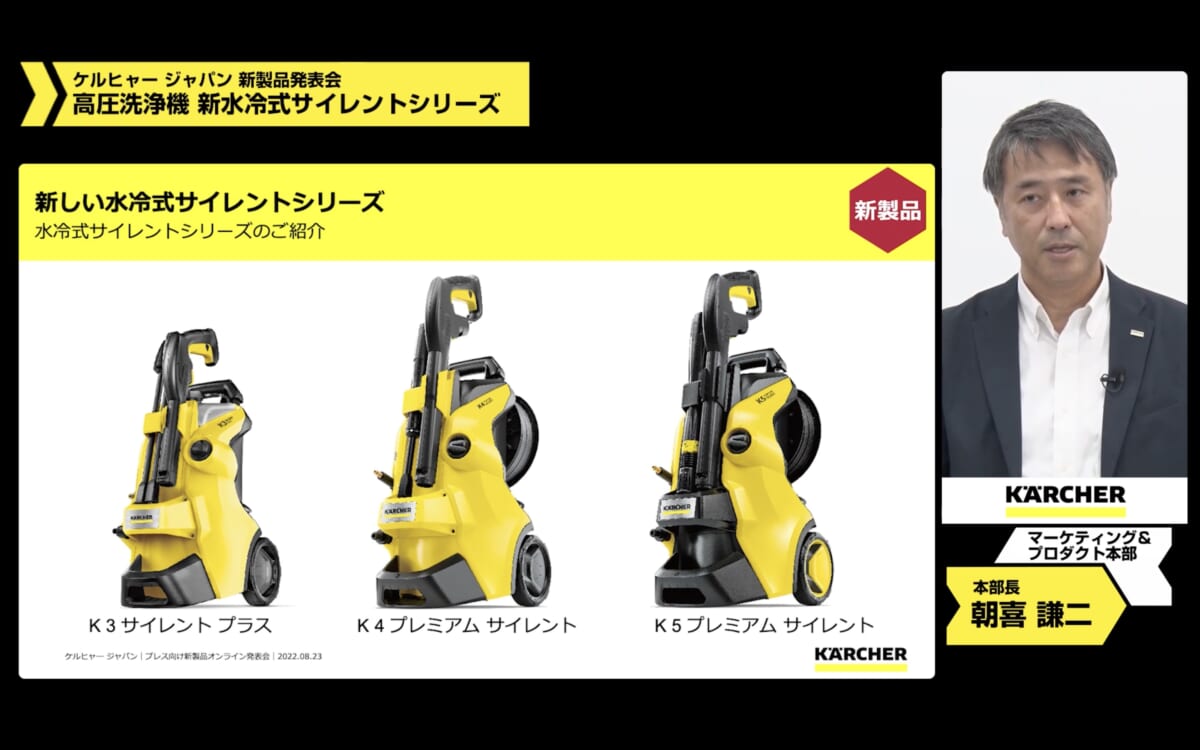 ケルヒャー ジャパンのオンライン発表会では、9年ぶりにフルモデルチェンジした高圧洗浄機の静音モデル「水冷式サイレントシリーズ」3モデルがリリースされました。