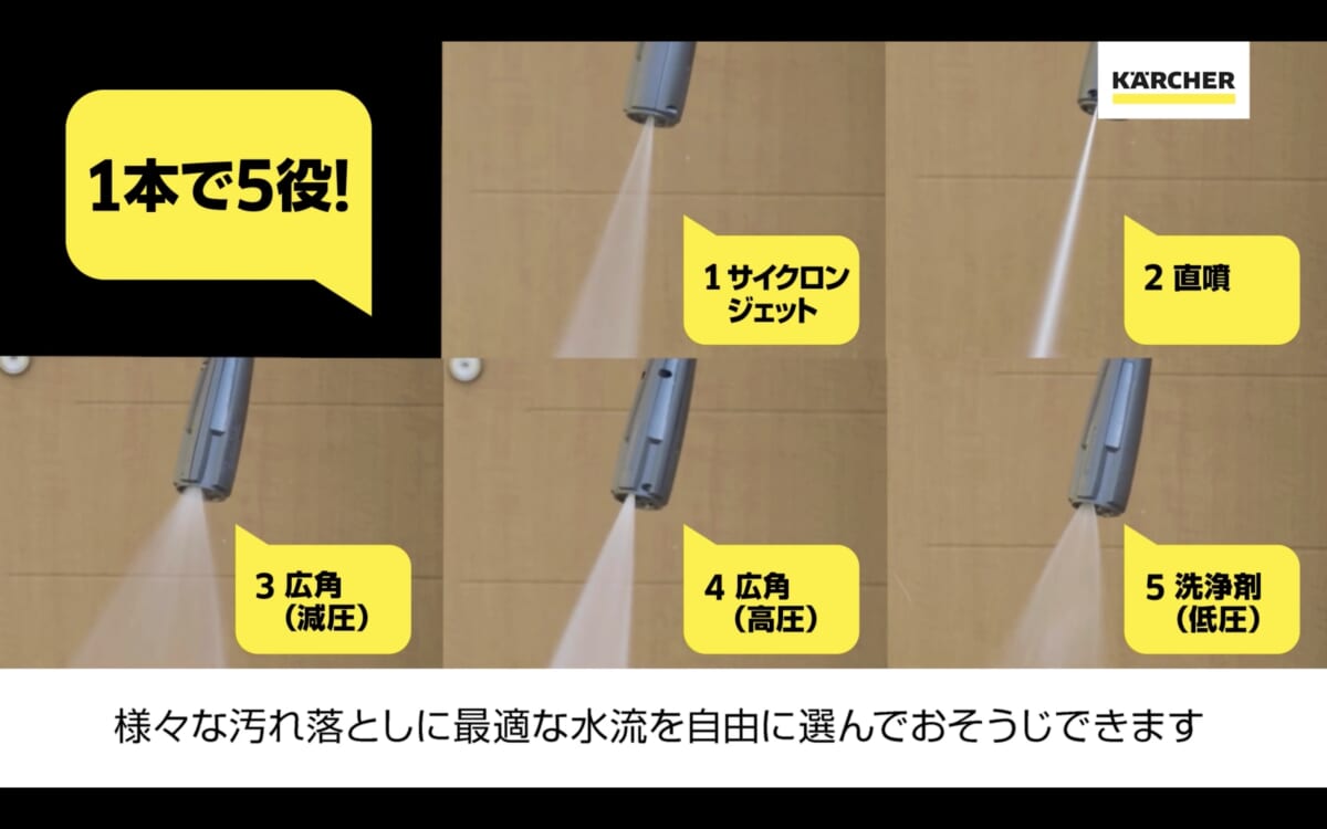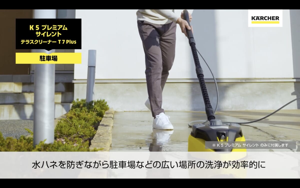 「K 5 プレミアム サイレント」は、3モデル共通で付属する「トリガーガン」のほか、5つの洗浄モードを切り替えられる「5in1 マルチパワージェット ノズル」を付属。広いテラスもラクに掃除できる「テラスクリーナー T 7 Plus」も同梱します。