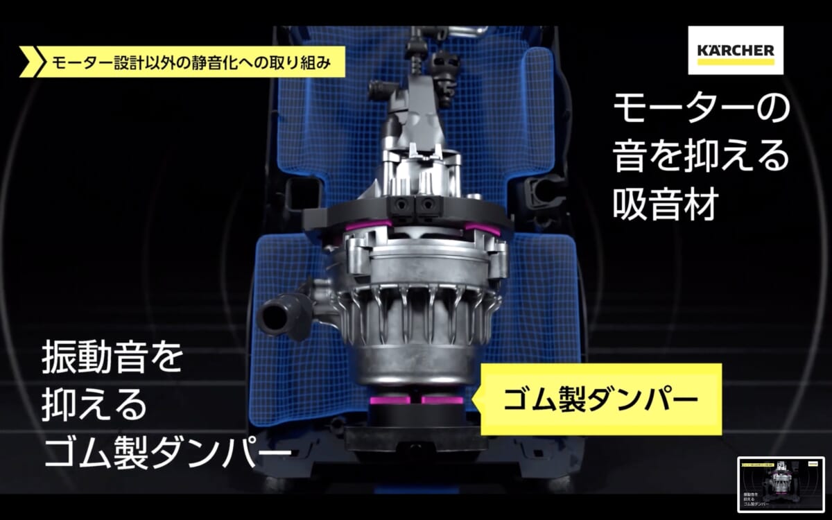 インダクションモーターは、回転体であるローターがブラシ等に接触しないうえ、水冷式によって安定したトルクを生み出して静音化に寄与しますが、この点は従来モデルと同様。今回の新モデルでは、従来機よりもさらに音圧レベルを10%(10dB)低減させ、体感音を50%カットしています。それを実現したのが、モーターの振動を抑えるゴム製ダンパーや本体内の吸音材、そして音を外に漏らさない本体カバーです。
