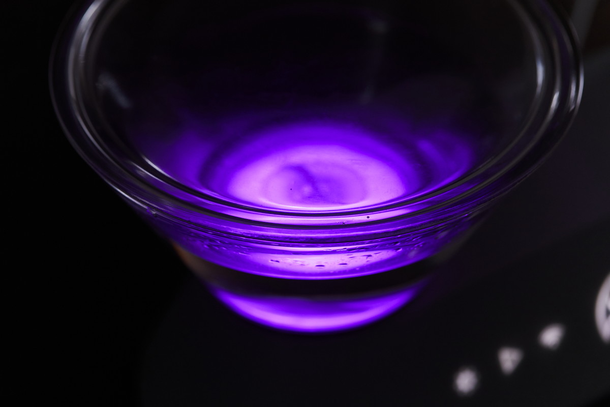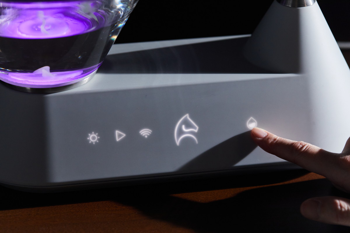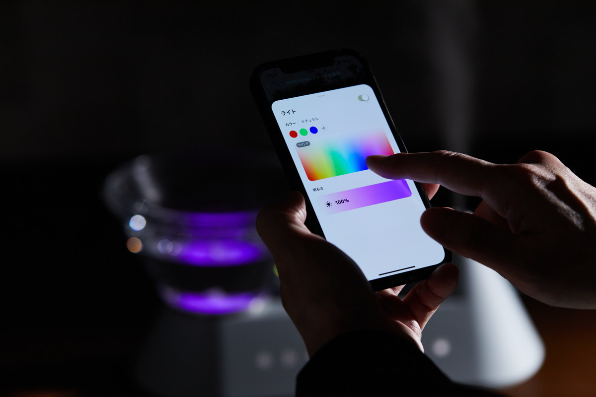 さらにもう一つのにくい演出が「光」です。本機はガラスタンクの下にLEDライトを備えており、先述のアプリで細かく設定が可能なのです。その真骨頂が味わえるのが夜。タンクの下から鮮やかな光が浮かび上がり、ガラスと水を透過することで、とにかく神秘的になるんです。