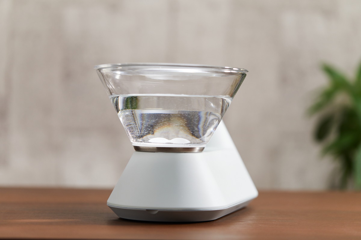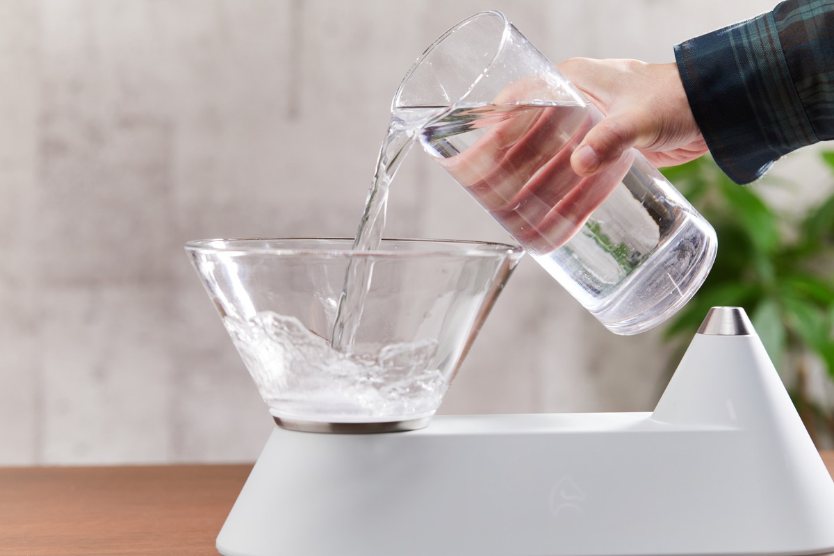 実際に使ってみると、デザインがやっぱりいいですね。シンプルでフォルムが美しいのはもちろんのこと、水がキレイに見えて、背景が透過して見えるガラスタンクの質感もいい。筆者の自宅の場合、観葉植物が背景に透けてみえるので、これもまた格別なんです。