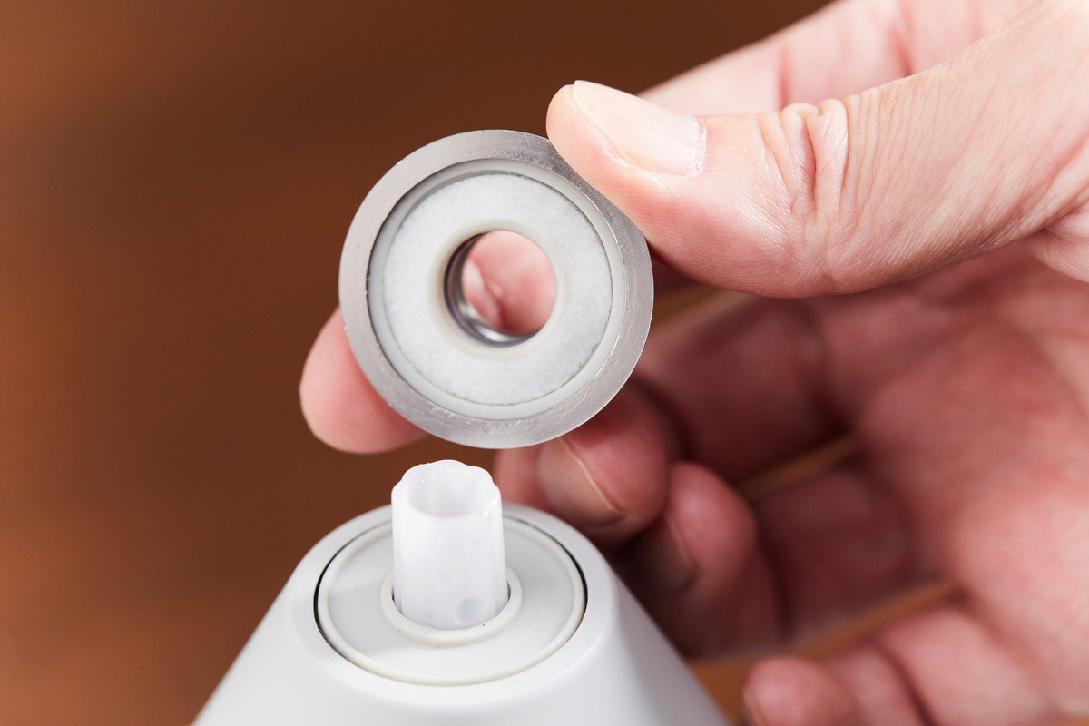 もうひとつのリラックス要素が「香り」=アロマユニットの存在です。ミストの噴出口にある金属のパーツを外すと、裏側には円形のコットンが装着されており、ここにアロマオイルを垂らすとミストとともに香りが拡散できるのです。柑橘系のアロマオイルを使ってみたところ、ああ…‥そこはかとなく、ほのかに香ってくるのがいいですね。香りは瞬時に気分をリセットしてくれると言いますが、爽やかな空気を胸いっぱいに吸うと、確かに気分が一新されるのがわかります。