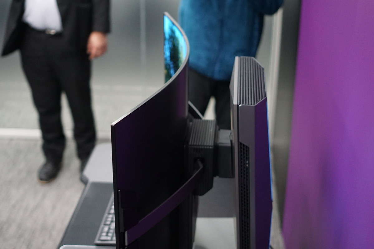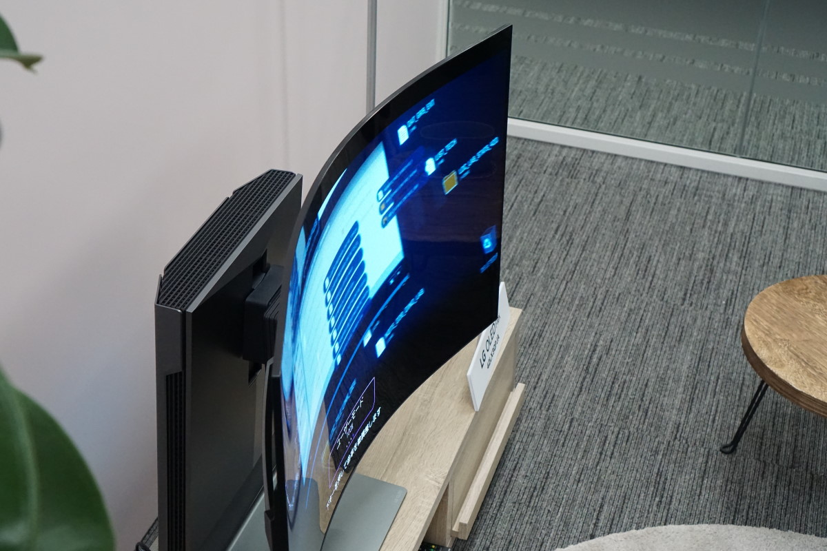 このLG OLED Flexは、そういった曲面型のメリットを生かしつつ弱点を補うために、同社として初めて可変式の構造を採用。水平から曲率900R(半径90cmの円を描く曲線)まで20段階で曲率を調整することができます。