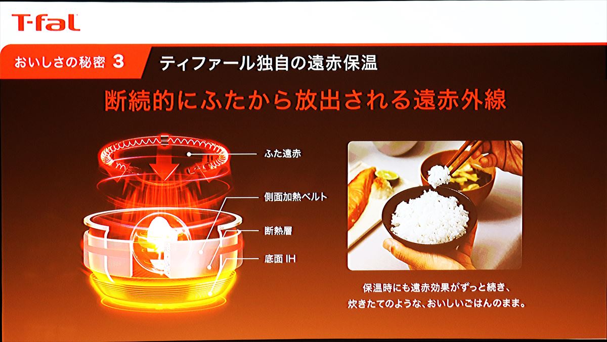 この遠赤外線は保温時にも活用されています。断続的に遠赤外線を放出するとともに、側面の加熱ベルトと底面IHの組み合わせで釜内の温度を均一に保ち、長時間の保温でも美味しさを維持できるとしています。