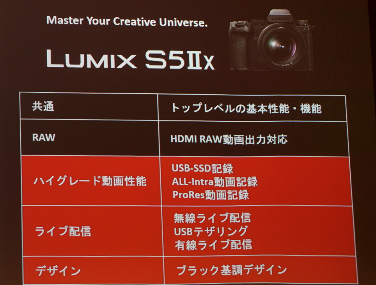 ハイスペックモデルのDC-S5M2Xではそれらの基本性能に加え、高画質で動画編集にも適したProRes動画記録や高い圧縮率で記録できるAll-Intra動画記録などのハイグレードな動画撮影が可能。さらに、カメラから有線/無線で直接動画のライブ配信が行えたり、USBテザリングも可能など動画配信者向けの機能も搭載。本体デザインもロゴなどが目立たないオールブラック仕様となっています。