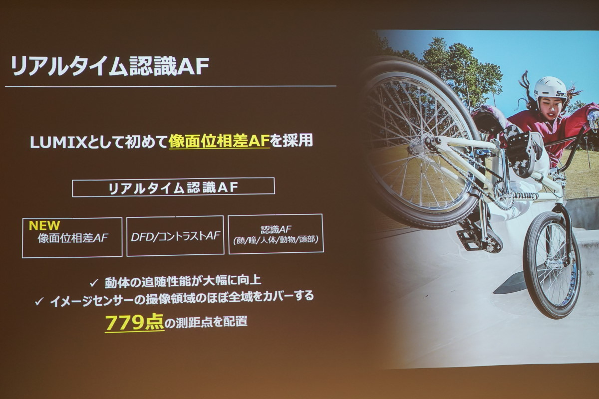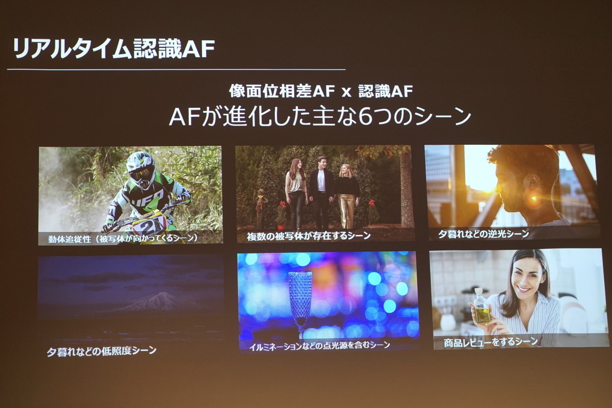 この像面位相差AFと認識AFにより、被写体がこちらに向かってくるシーンや複数の被写体があるシーン、夕暮れなどの逆光のシーンなど、6つのシーンでAF性能が向上しているとのこと。