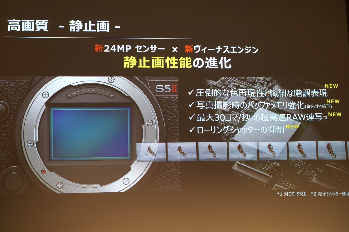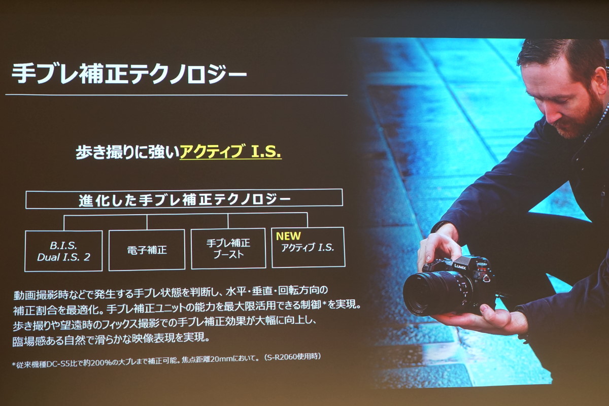 発表会では動くモデルを撮影できる試写会が実施されましたが、AFの追従性はかなり高く、モデルが前後に動いてもピタリとピントが合ったままスムーズに追従してくれました。また、手ブレ補正のデモでは、スケートボードに乗って激しく動く被写体を自転車で追いかける映像が流されましたが、かなりアクティブな動きでも手ブレがほとんどなく、まるでスタビライザーを装着しているようななめらかさ。静止画も動画の撮影も、かなりアクティブなシーンに対応できそうです。
