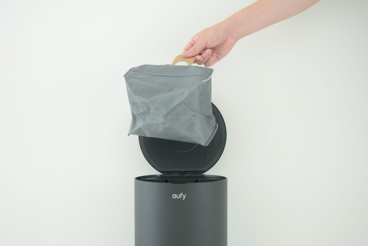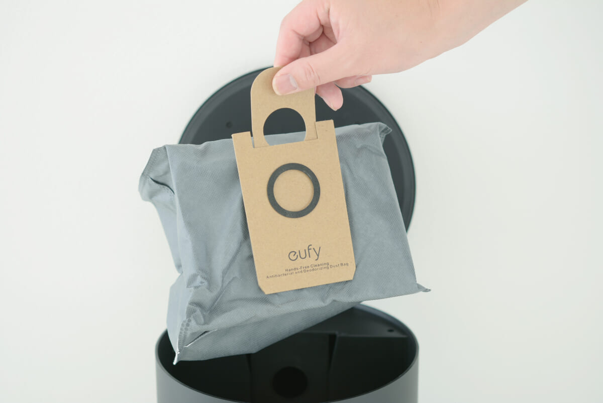 付属する自動ゴミ収集ステーションは、ロボット掃除機本体のダスト容器に集めたゴミを自動吸引してくれる。掃除するたびにダスト容器のゴミを捨てるのは手間だが、容量3Lのダストバッグにゴミを溜める「Eufy RoboVac L35 Hybrid+」なら、約2か月間ゴミ捨てが不要。ゴミ捨ての負担がグンと低減されるのはもちろん、紙パック式なので、ゴミに直接手に触れずに捨てられるのも美点だ。