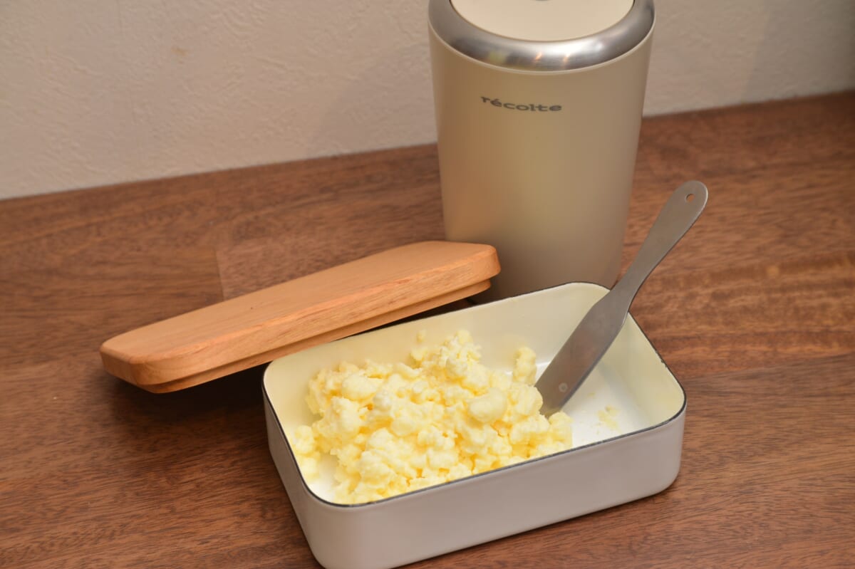 分離したバターは水分をしっかり切って保存容器に保存します。なお、このように自家製で作るメリットとして、塩分を好きな量に調整できる点があります。また、半分は無塩、もう半分は有塩といった形に作り分けも可能。今回は無塩で作りました。