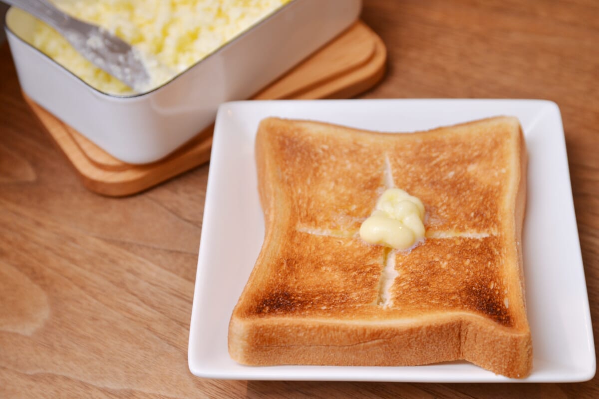 このバターの味をトーストにのせてチェック。バターのミルキーなコクとパンの香ばしさがマッチしておいしかったです。