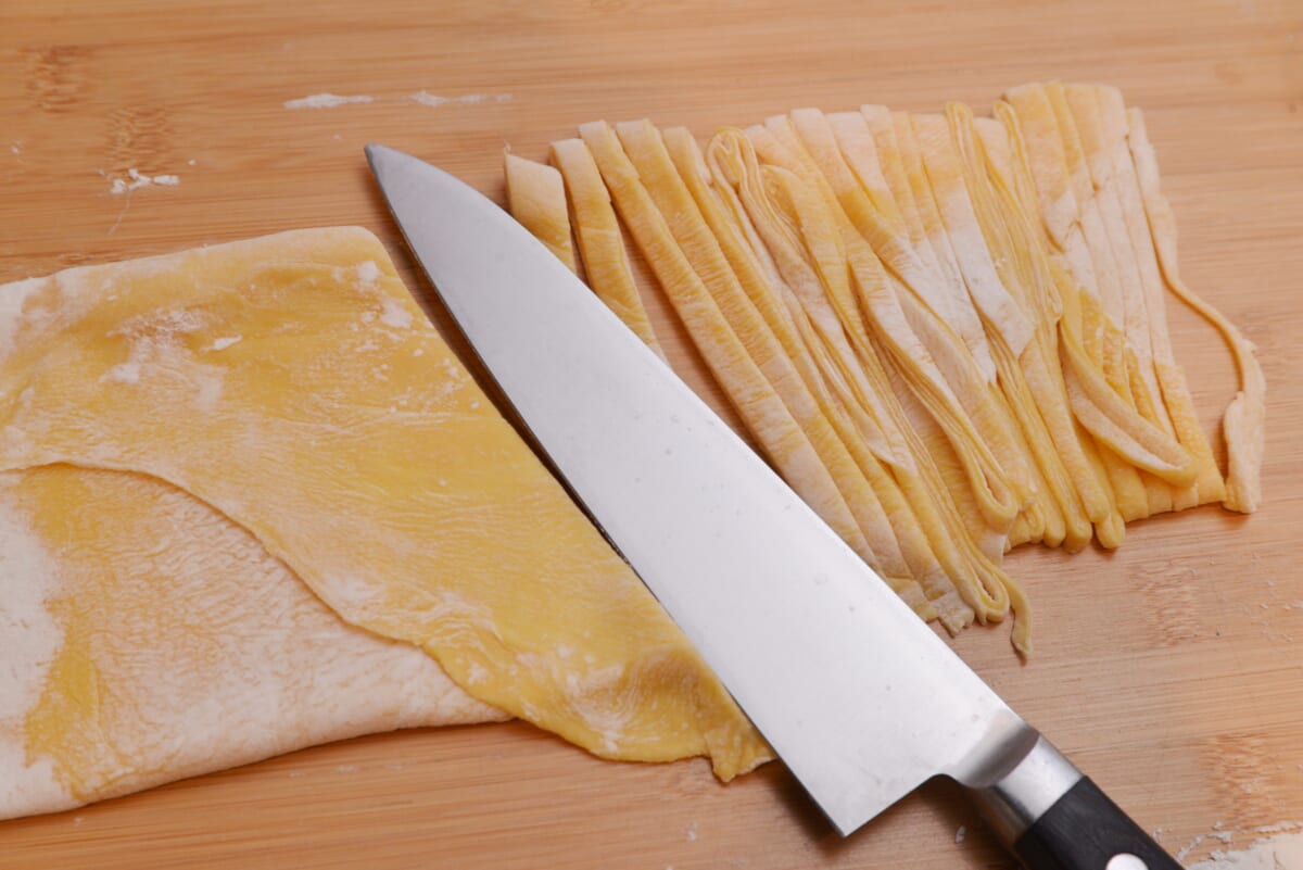 でき上がった生地はひとまとめにしてラップで包み、冷蔵庫で2時間ほど休ませます。こうすることで熟成され、ムラがなくなるとともにハリやコシが醸成されるのです。十分寝かせたら取り出し、延ばして切り出す工程へ。