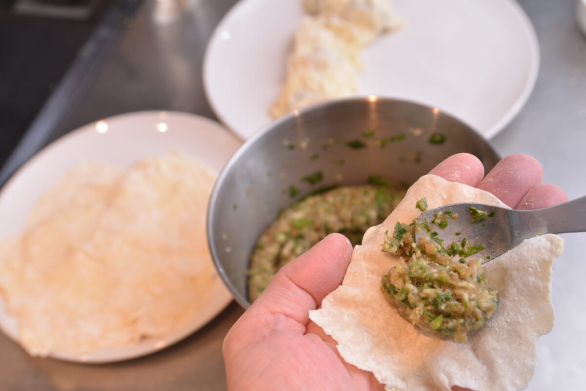 ここまでやったら、あとは普通に餃子を包む手順でOK。焼き餃子でもいいのですが、筆者は自家製生地のもちもち感を楽しむために水餃子にしてみました。