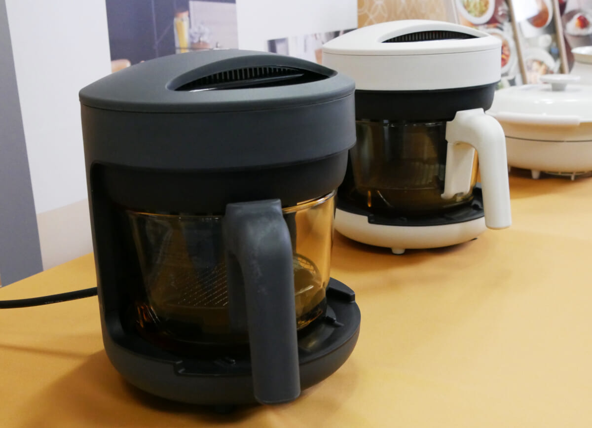 「揚げる」家電は、「ポット型コンベクションオーブン」が登場。こちらも、200×220×245mmとA4サイズに収まるコンパクト設計です。ヒーターとファンを搭載した同商品は、ファンで熱風を対流させることで食材全体を包み込むように加熱するので、油を使わなくてもサクサクした衣の揚げ物を調理することが可能となります。内網はフッ素樹脂コーティングが施されているので、食材がこびりつきにくく、接触面積が少ないメッシュタイプにすることで油落ちの良さにもこだわったそう。