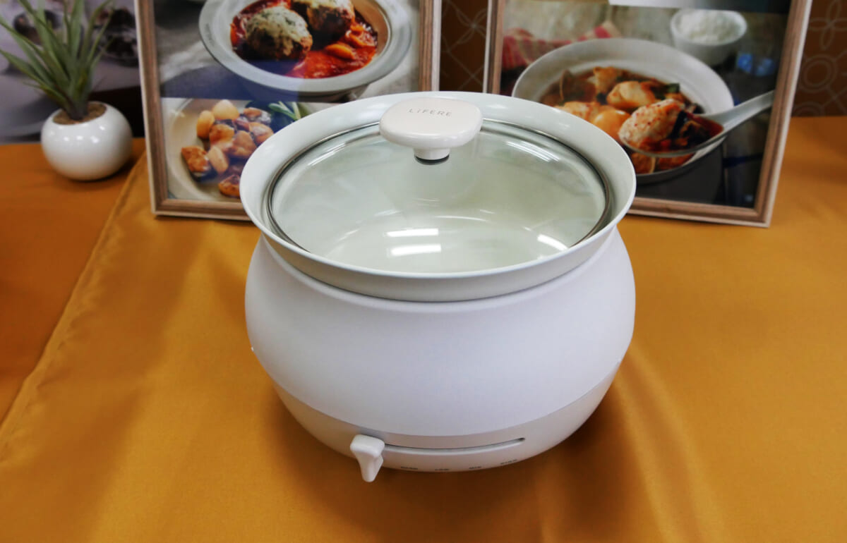 3つ目の「煮る」家電は、IH卓上調理なべ「HOT DISH cocotte」です。なべをIHクッキングヒーターにホールドする固定リングには、高い耐熱性を誇る特殊なプラスチックが採用されており、うっかり手が触れても火傷しないよう配慮が施されています。温度調節は保温、LOW、MID、HIGHの4段階で、常に一定温度での調理や保温が可能。もちろん、IHの特徴である加熱の素早さと温度の安定性も。そのため、LOWモードを活用すれば、例えば湯葉のように低温度でじっくり作る料理も楽しむことが可能となりました。
