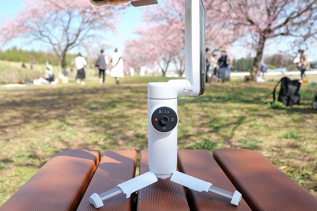 ジンバル本体は約369gと軽量で、しかも折りたたみ式なのでコンパクト。ジンバルを装着するための専用スマホホルダーは、マグネット吸着式で装着時の位置合わせも容易です。スマホを装着したらジンバルのアームをクルッと回転させるだけで起動し、専用アプリとも1タップで接続してすぐに撮影ができます。