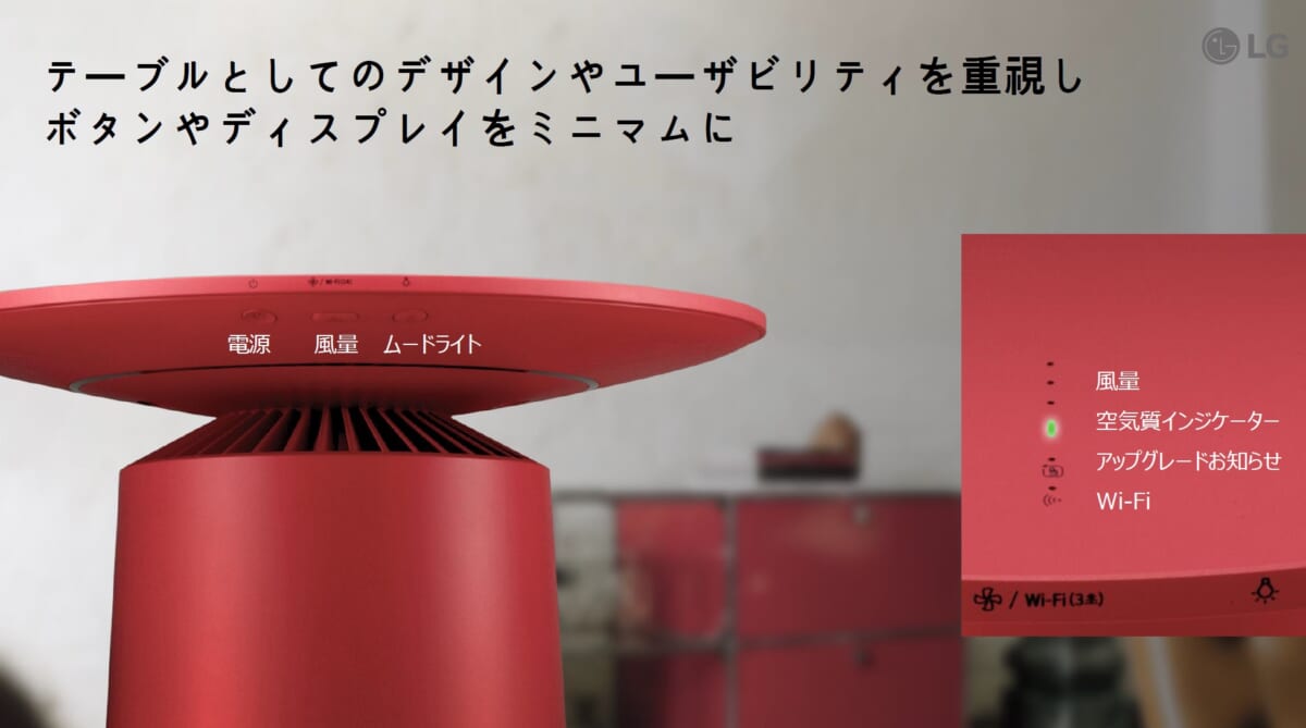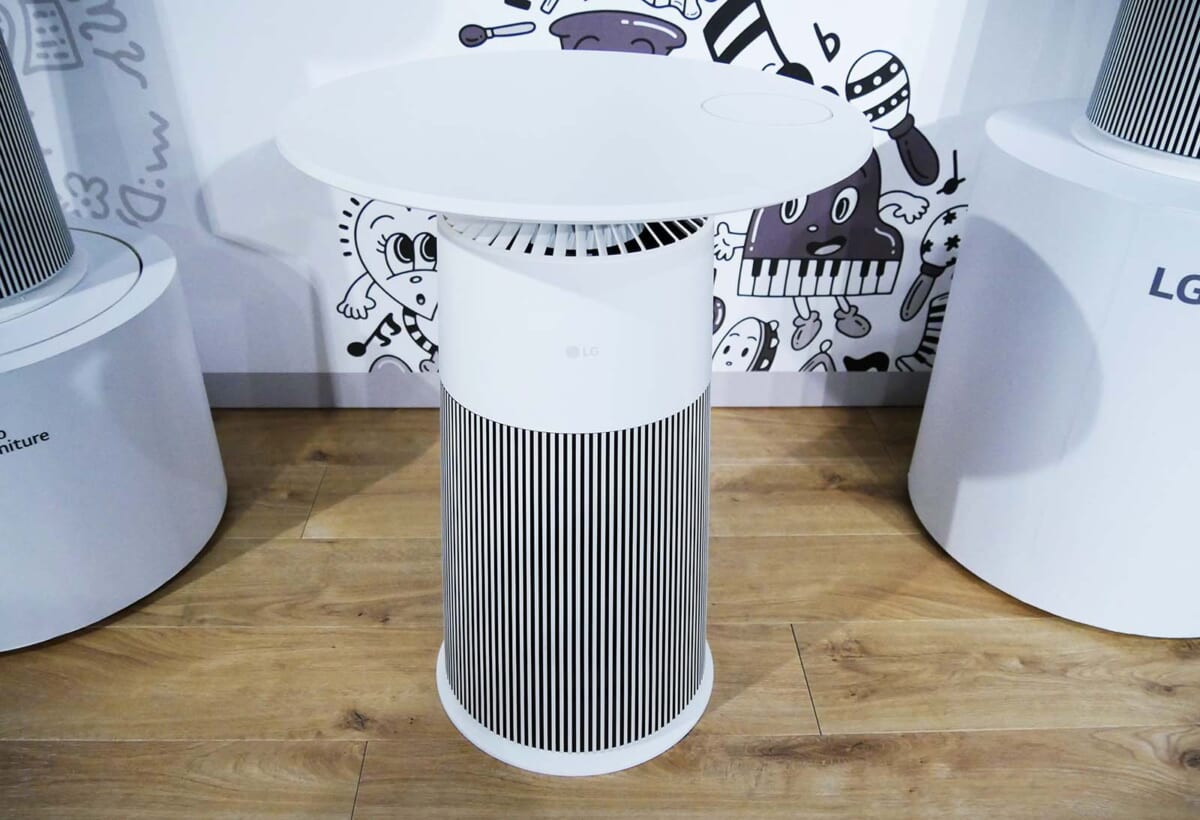 「LG PuriCare AeroFurniture」は同社の空気清浄機シリーズ「LG PuriCare」の新ラインアップとなるモデルで、空気清浄機としてはもちろん、サイドテーブル、間接照明になるムードライト、ワイヤレス充電の1台4役の機能が備えられている。