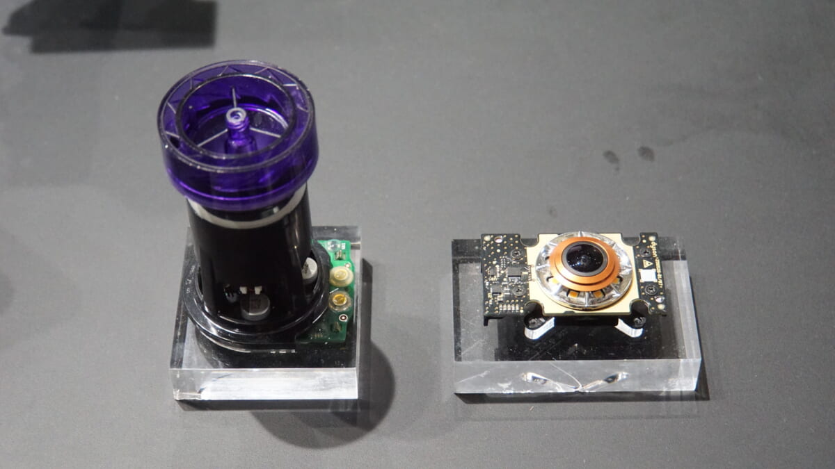 ↑毎分最大11万回転する独自開発のDyson Hyperdymiumモーター(写真左)と魚眼レンズを用いた「360°ビジョンシステム」(写真右)