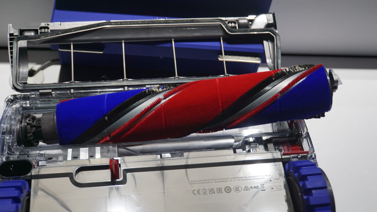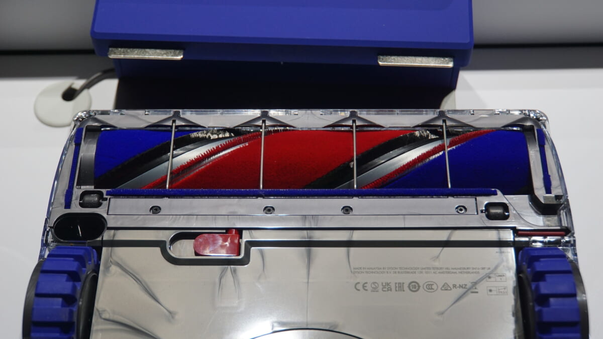 Dyson 360シリーズは本体最前面にブラシバーを搭載する「D型シェイプ」に近いスタイルが特徴ですが、Dyson 360 Vis NavではさらにD型シェイプに近付いています。そのブラシバーは、フローリングから大きなゴミを取り除く柔らかいナイロンブラシ、静電気の発生を抑えて床の溝からホコリをかき集めるカーボンファイバーブラシ、カーペットの奥からゴミをかき取る硬いナイロンブラシの3つを組み合わせた「トリプルアクションブラシバー」を、シリーズで初めて搭載しました。