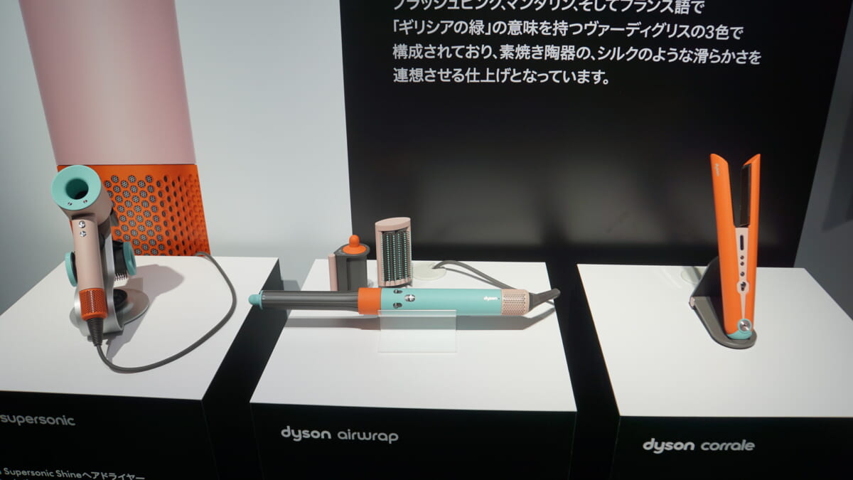 ↑「G-Force」のカラーリングをあしらった限定カラーのヘアケア製品「Ceramic Pop」シリーズ。左からDyson Supersonicヘアドライヤー、Dyson Airwrapマルチスタイラー、Dyson Corraleヘアアイロン