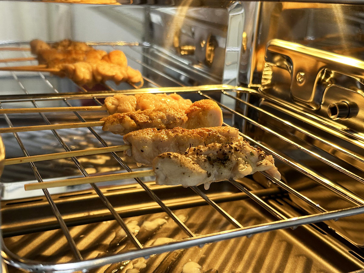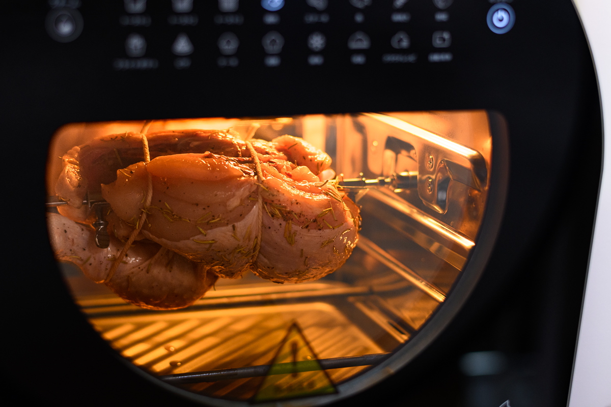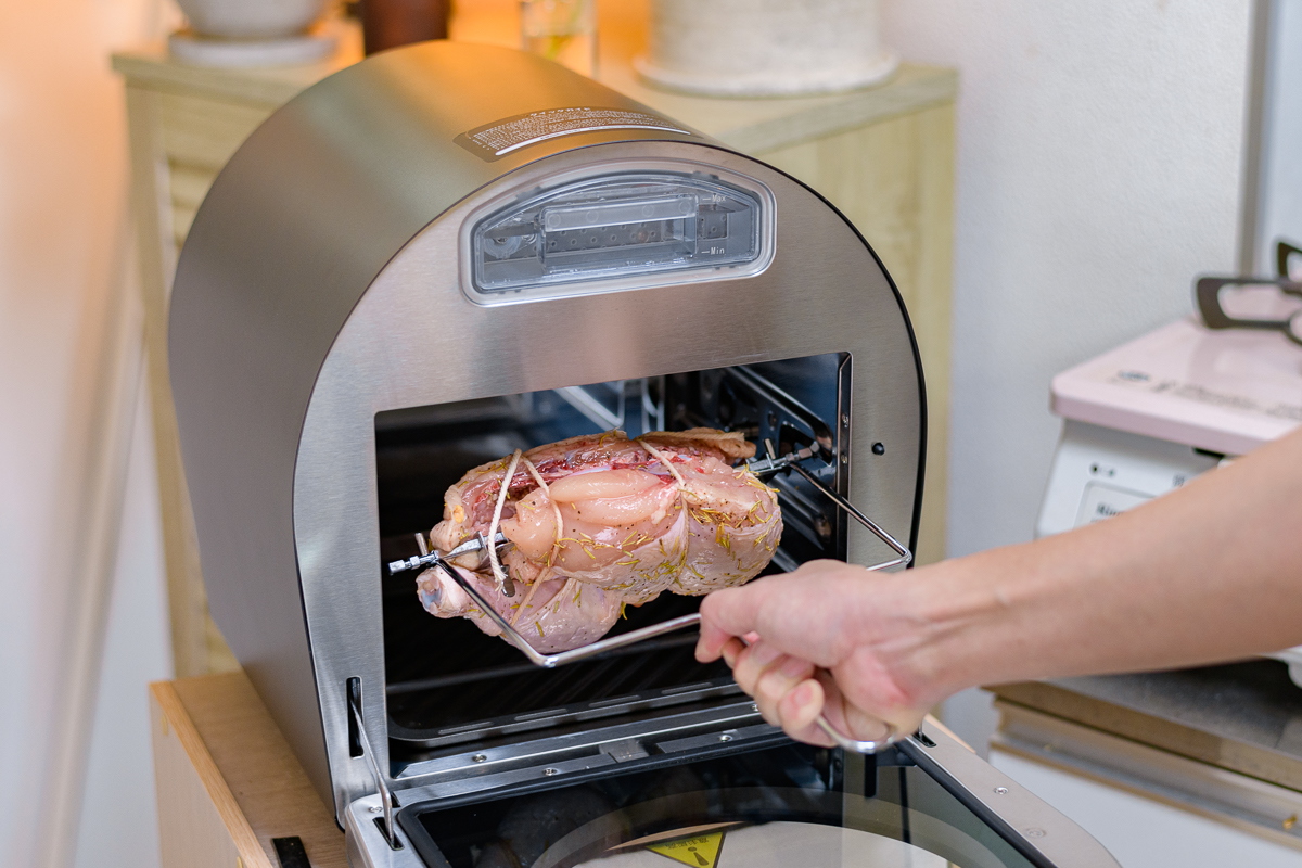 では、ロティサリーチキンの調理を振り返っていきましょう。使用した丸鶏は約1kg。今回、購入した丸鶏が大きすぎたので、半身での調理です。鶏にはオリーブオイルと塩こしょう、ローズマリーをもみこんで下ごしらえ。調味料がなじんだら、付属のロティサリーフォークに固定し、さらに腕や脚がブランブランしないよう、ひもでコンパクトにしばって固定します。丸鶏を刺した状態のロティサリーフォークを庫内にセットすれば準備完了!