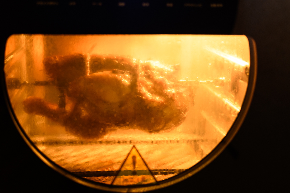 プリセットメニューの「鶏肉」を押すと……おお! チキンが回転し始めました。回るチキンなんて、情報番組でしか見たことないのに! これはテンションが上がります。