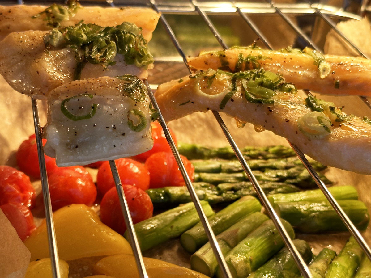 このほか、庫内の中段で鮭ハラスと下段で焼き野菜を調理する(下写真)など、別々の食材の同時調理も可能。主菜と副菜が一気に調理できて、バランスが良い食事が摂れるのがうれしいです。筆者の場合、中段にパン、下段にソーセージとブロッコリーを置いて同時調理し、一度で充実した朝食が作れるのも便利でした。