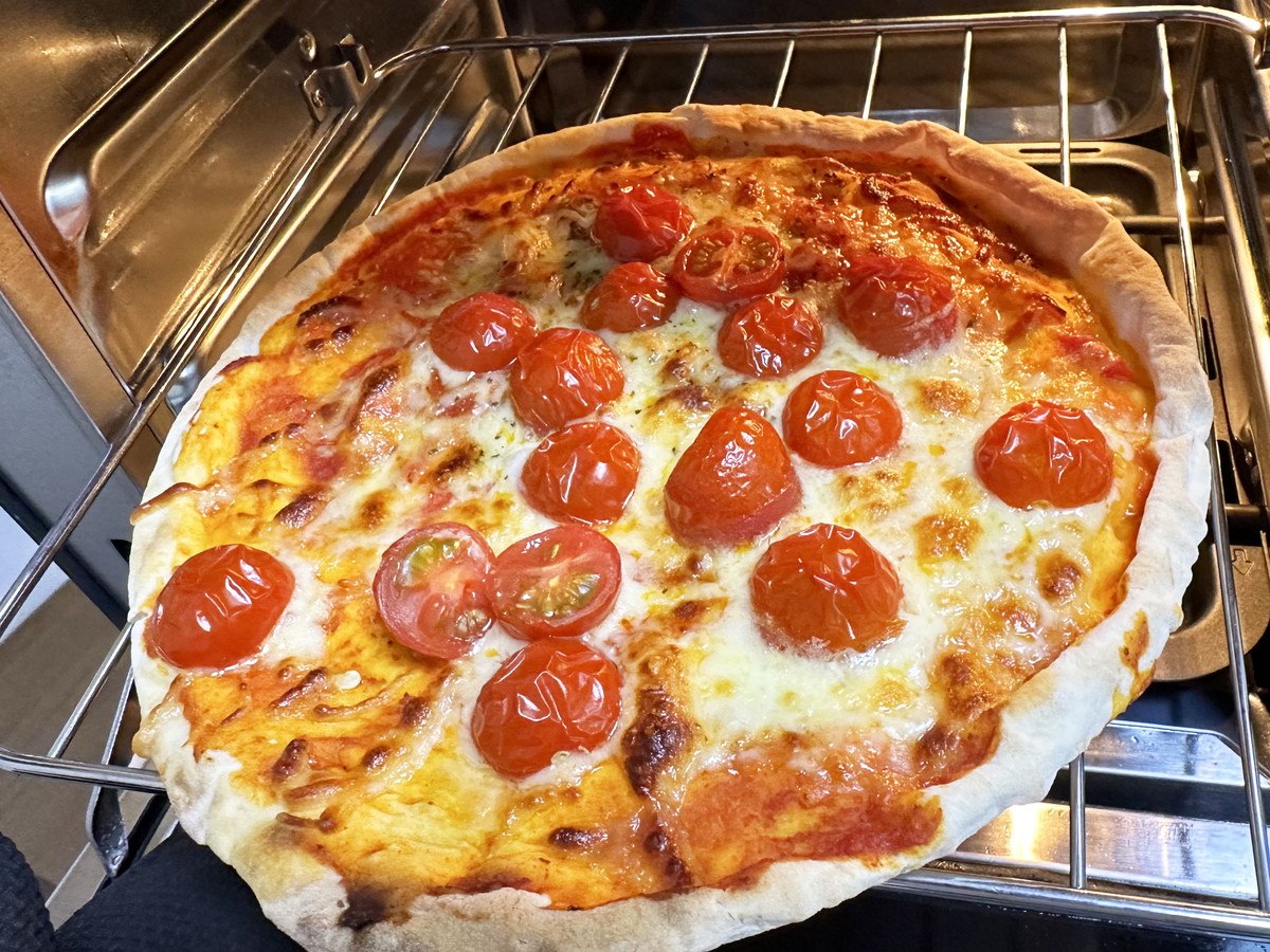 あと、40代独身・ひとり酒が好きな筆者としては、お酒に合う料理がカンタンにできたら何も言うことはありません。ビールに合わせる目的で市販の大きめ冷蔵ピザ(22.5cm)を購入。大きな庫内に難なく入り、10分程度で最高の焼き上がりに。焼きたてピザとビールの相性といったらもう……。