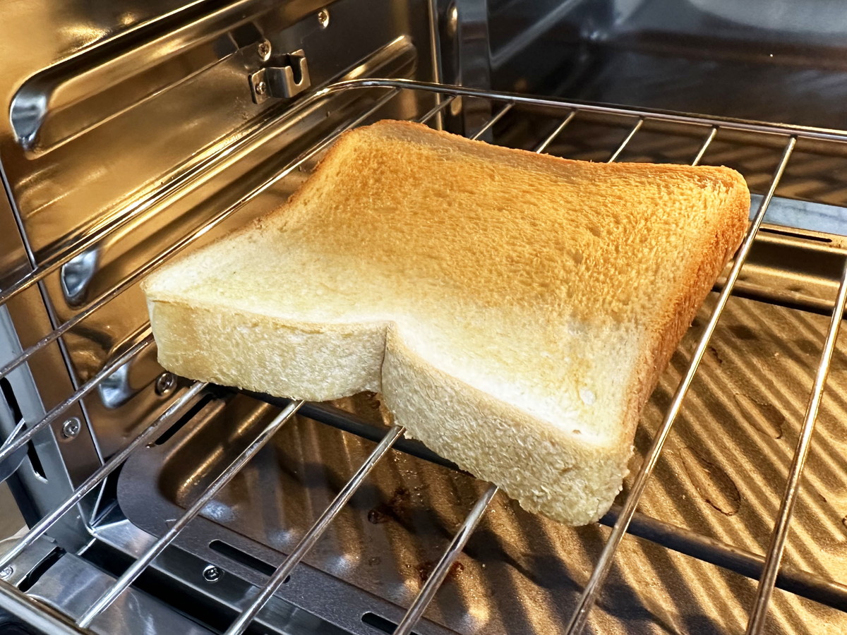 まずはトースト。3種類あるトーストのメニューのなかで、スチームありの「もっちりトースト」で焼いてみました。うん、確かにもっちりしている! さっくりとした歯触りがあるものの、中はしっとり温まっていて小麦の甘みが感じやすくなっています。これは好きな味。口の中の水分が持っていかれることもないので、トースト単体でも食べやすかったです。